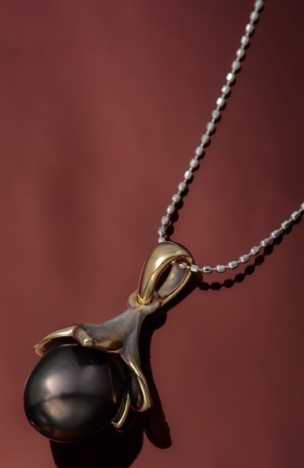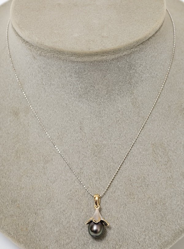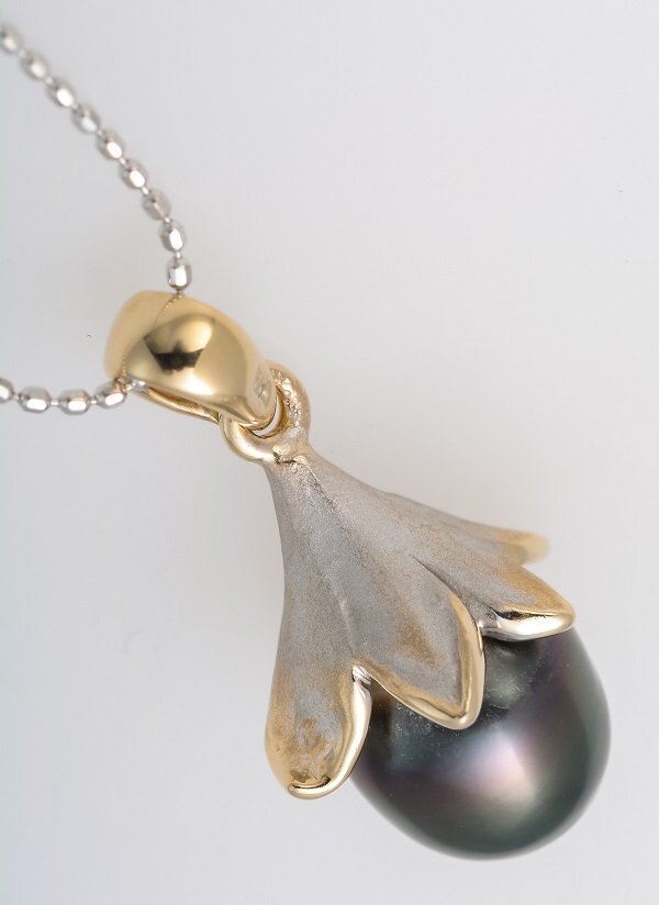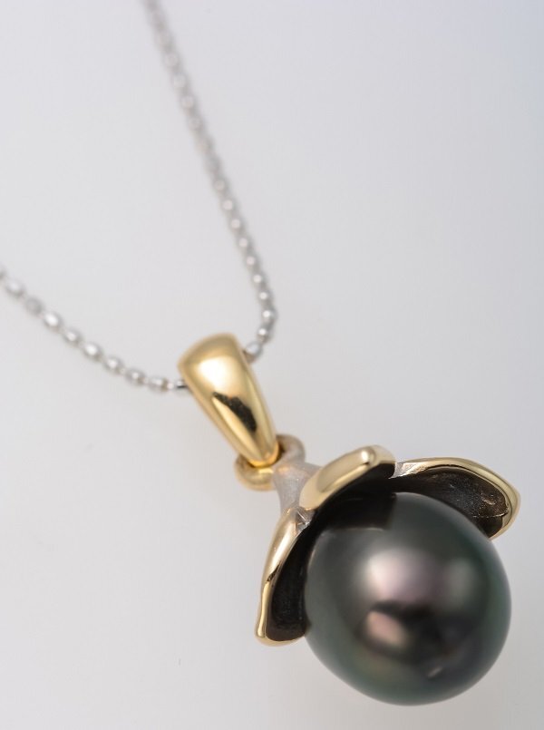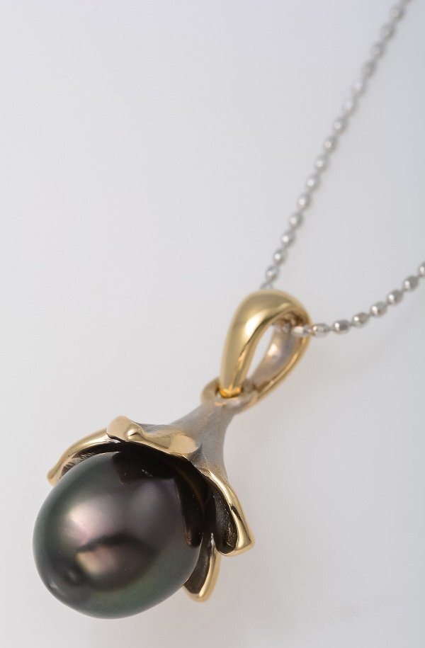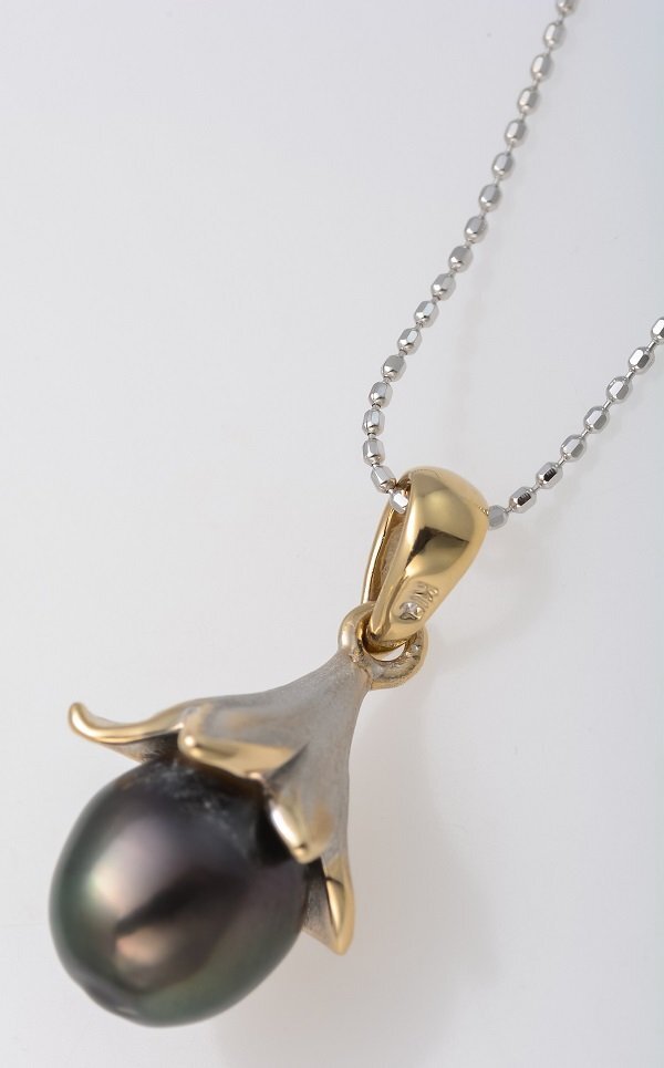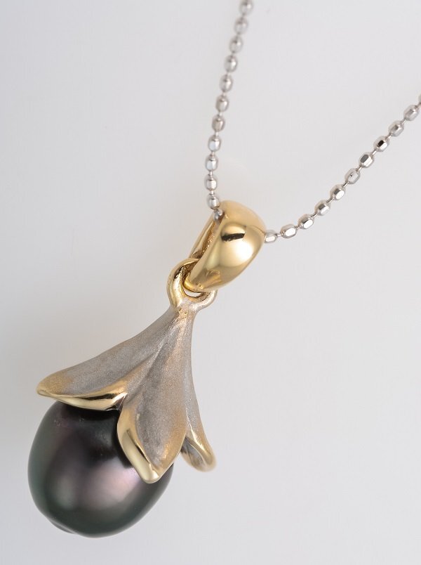 説明18金(ホワイトゴールド/イエローゴールド)の枠にブラックパールがセットされたネックレスです。