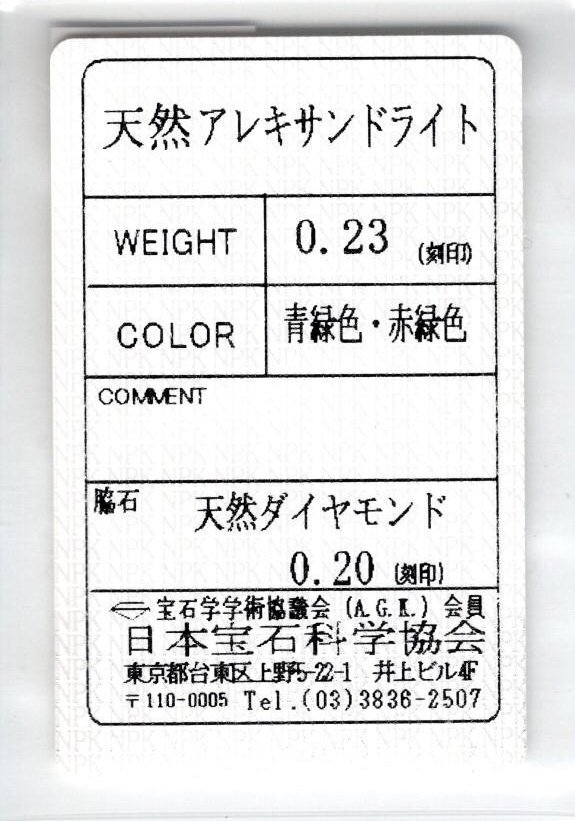付属品 | 日本宝石科学協会発行のソーティング(簡易鑑別) |