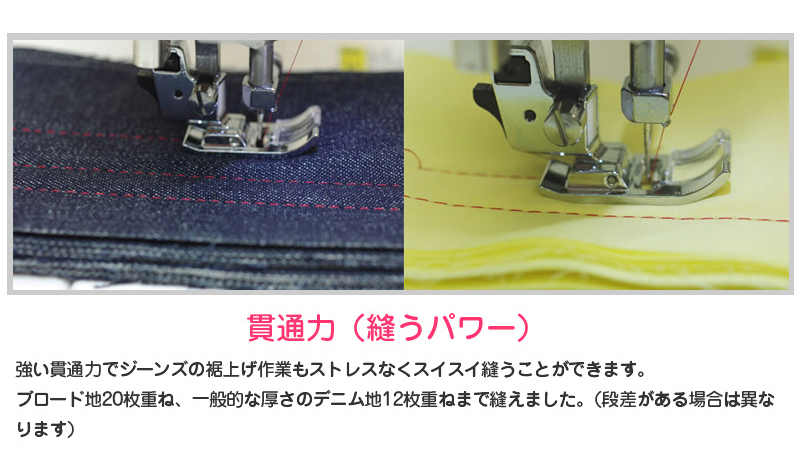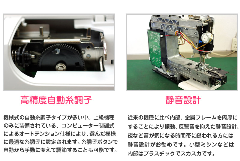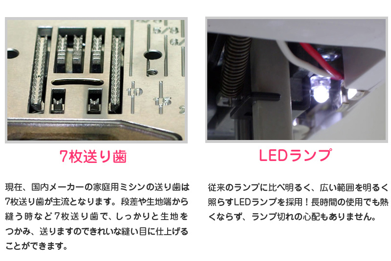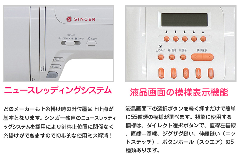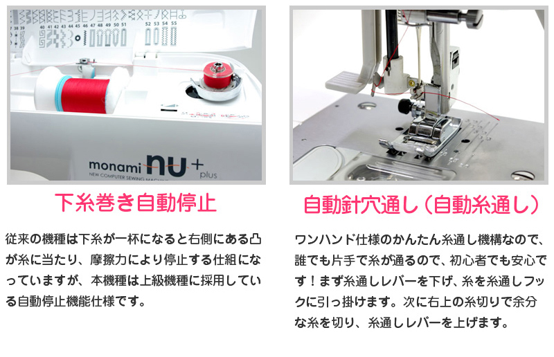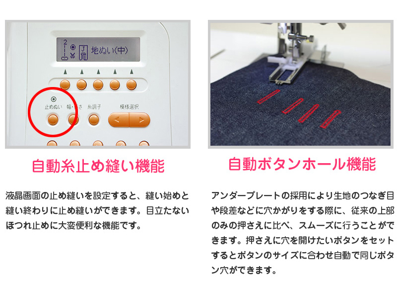 自動糸調子仕様(コンピューター制御)、液晶模様表示仕様、ニュースレッティッグシステム、下糸巻き自動停止機能、自動針穴通し(自動糸通し)、自動糸切り機能(オートカッター)、自動糸止め縫い機能(ほつれ止め)、光る手元スタート/ストップボタン、ワンタッチスローボタン、自動ボタンホール(アンダープレート付き)、7枚送り歯、貫通力(パワー)、LEDランプ、オール金属製針板、広いソーイングスペース、ハードケース標準装備、電源コード巻き込み式、静音設計