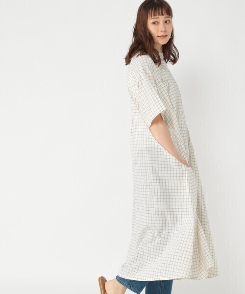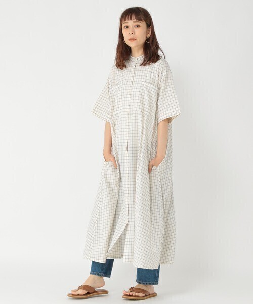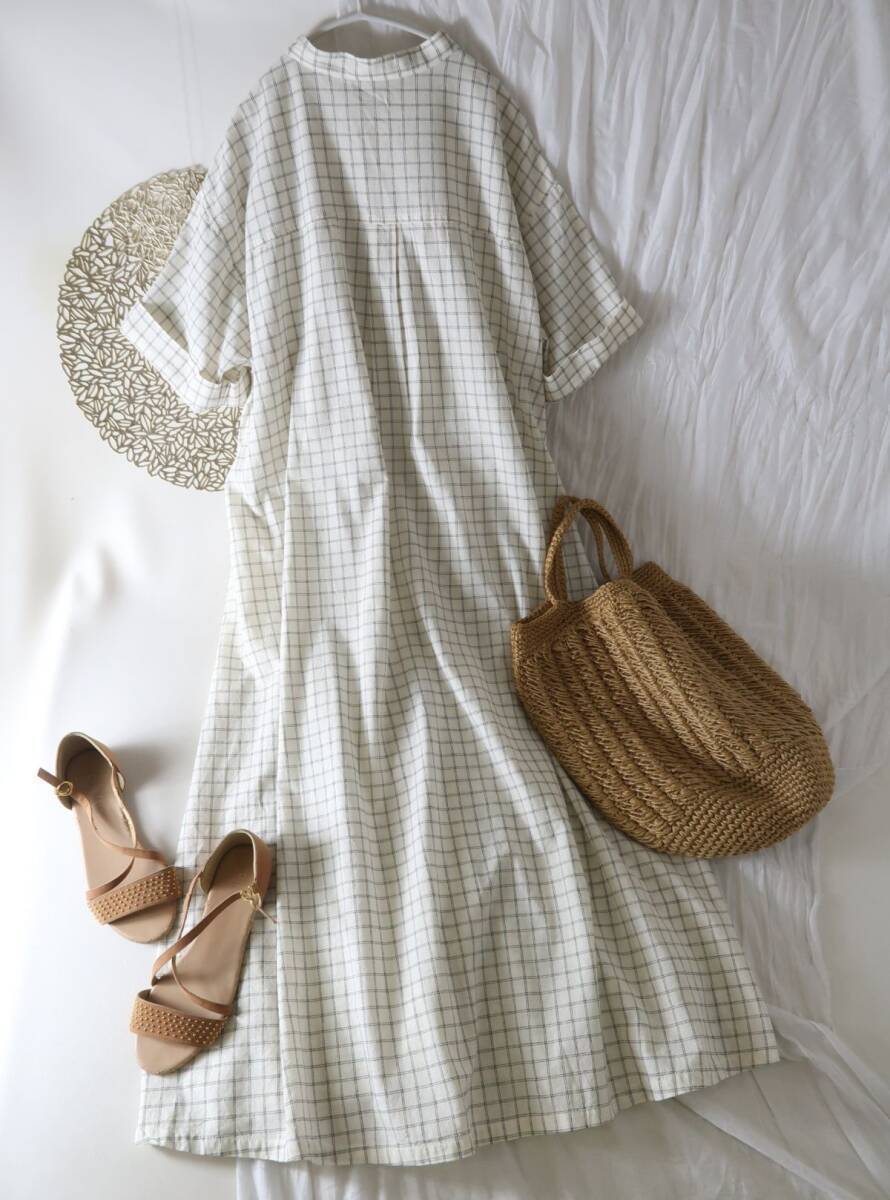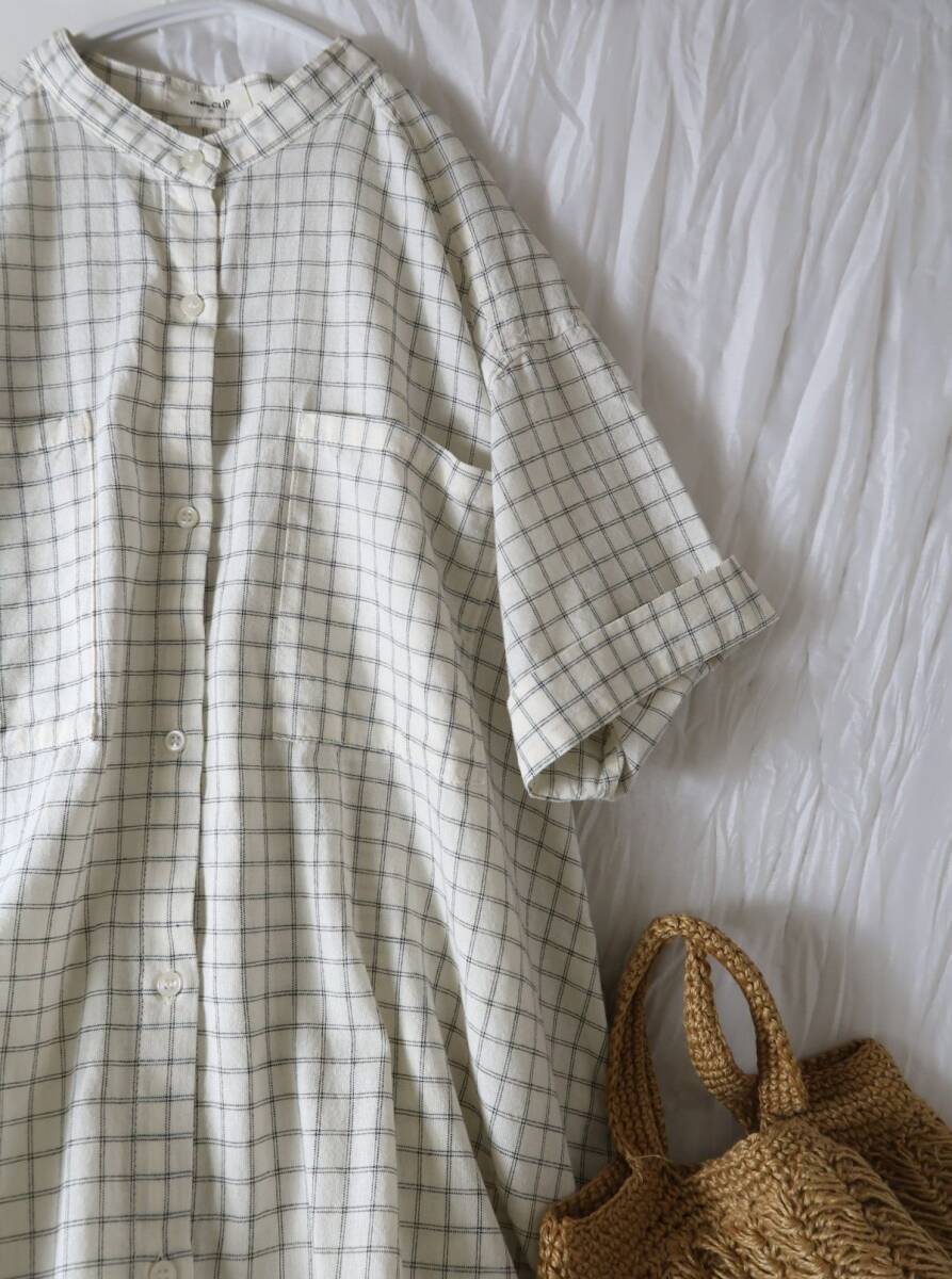 超美品☆スタジオクリップ STUDIO CLIP☆洗える 綿100% チェック柄 バンドカラーシャツワンピース Fサイズ☆A-O 4598