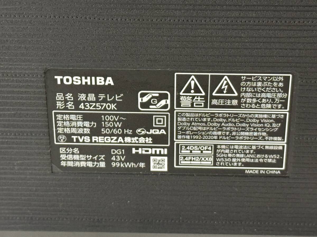 動作美品 TOSHIBA 液晶TV REGZA 43Z570L 2021年製 リモコン付 | |