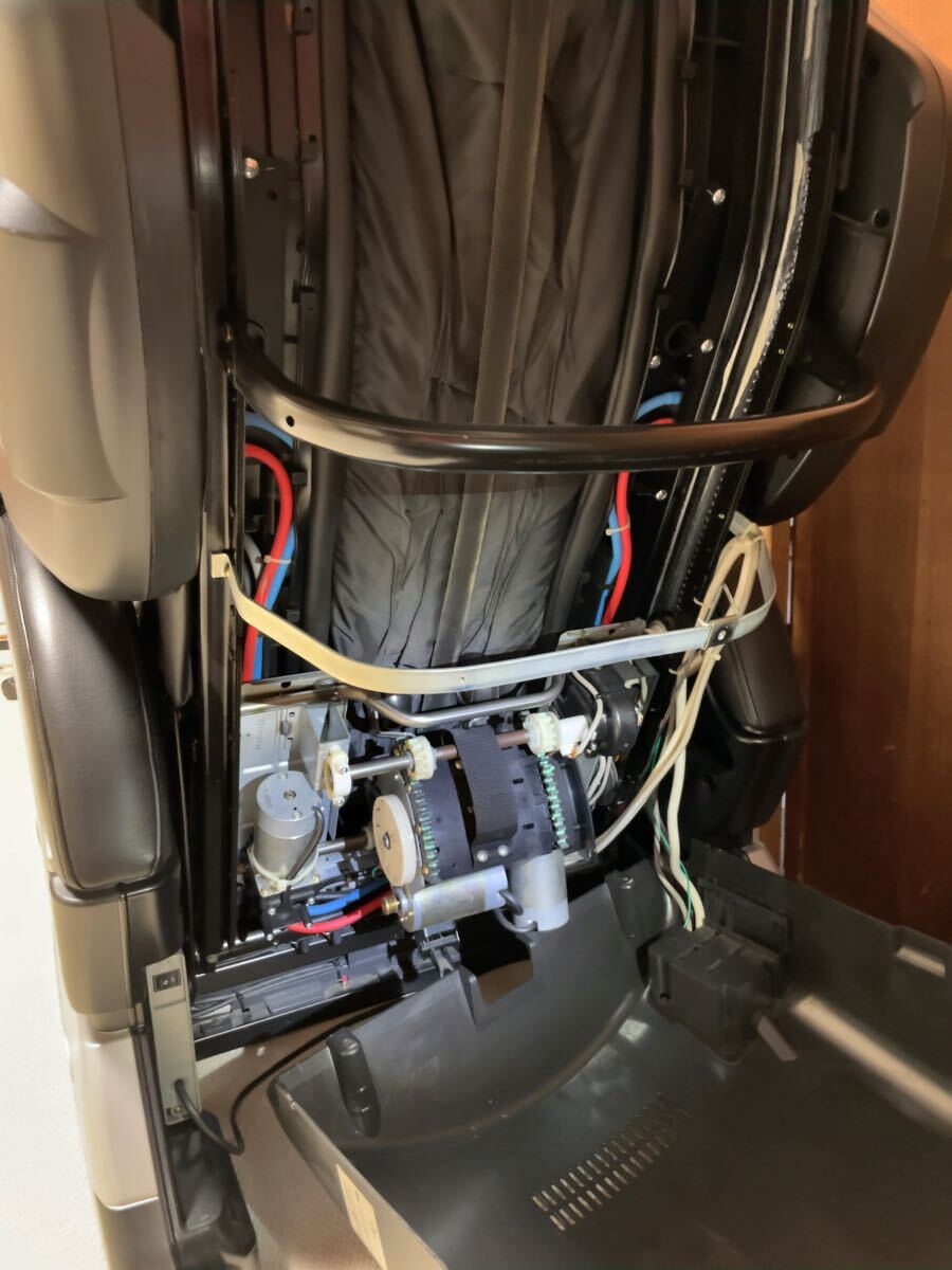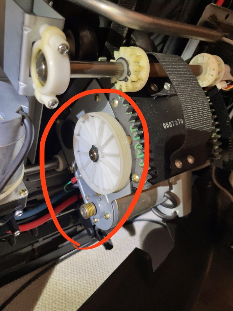 ★マッサージチェア裏のビスを6本外して 大きな裏ブタを開けます そうしますと 赤丸でかこったプーリーが出て来ます そこに 取り付けます