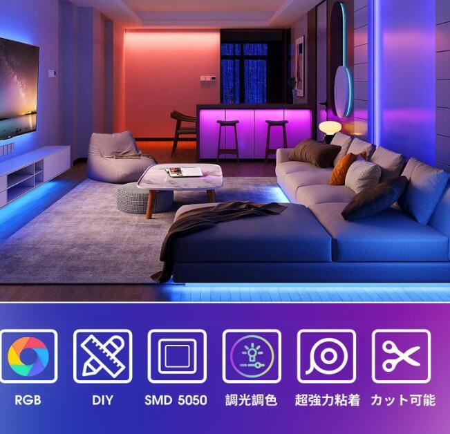 【高演色SMD5050チップ&リモコンでワンタッチ切替】このLEDテープライトトは、高演色のSMD5050チップを採用しており、色鮮やかで光の劣化がなく、長時間使用しても新しいままの鮮やかさを保ちます。商業空間の高級感から家庭の温かい雰囲気まで、あらゆるシーンを美しく演出し、細部にまで輝きを与えます。クラシックな赤、緑、青から、柔らかな暖白、ロマンチックな紫、活力あるオレンジまで、ワンタッチで切り替えができ、簡単に自分だけの光と影の世界を作り上げられます。専用の44キーリモコンを使って、明るさや色を自由に調整可能。パーティー、映画鑑賞、リラックスなど、どんなシーンでも完璧な照明を提供します!【ご注意】リモコンを使用する前に、底面の絶縁シートを取り外してください。使用時は、リモコンを受信部に向けておいてください。