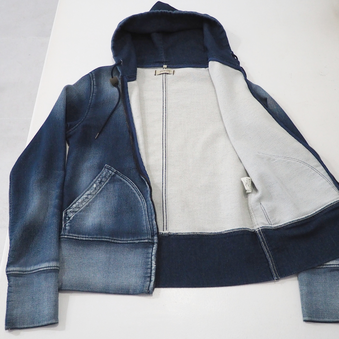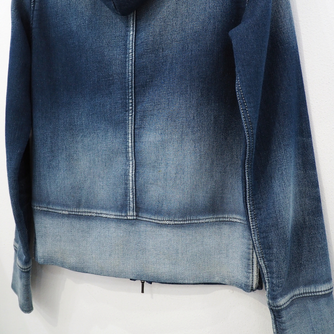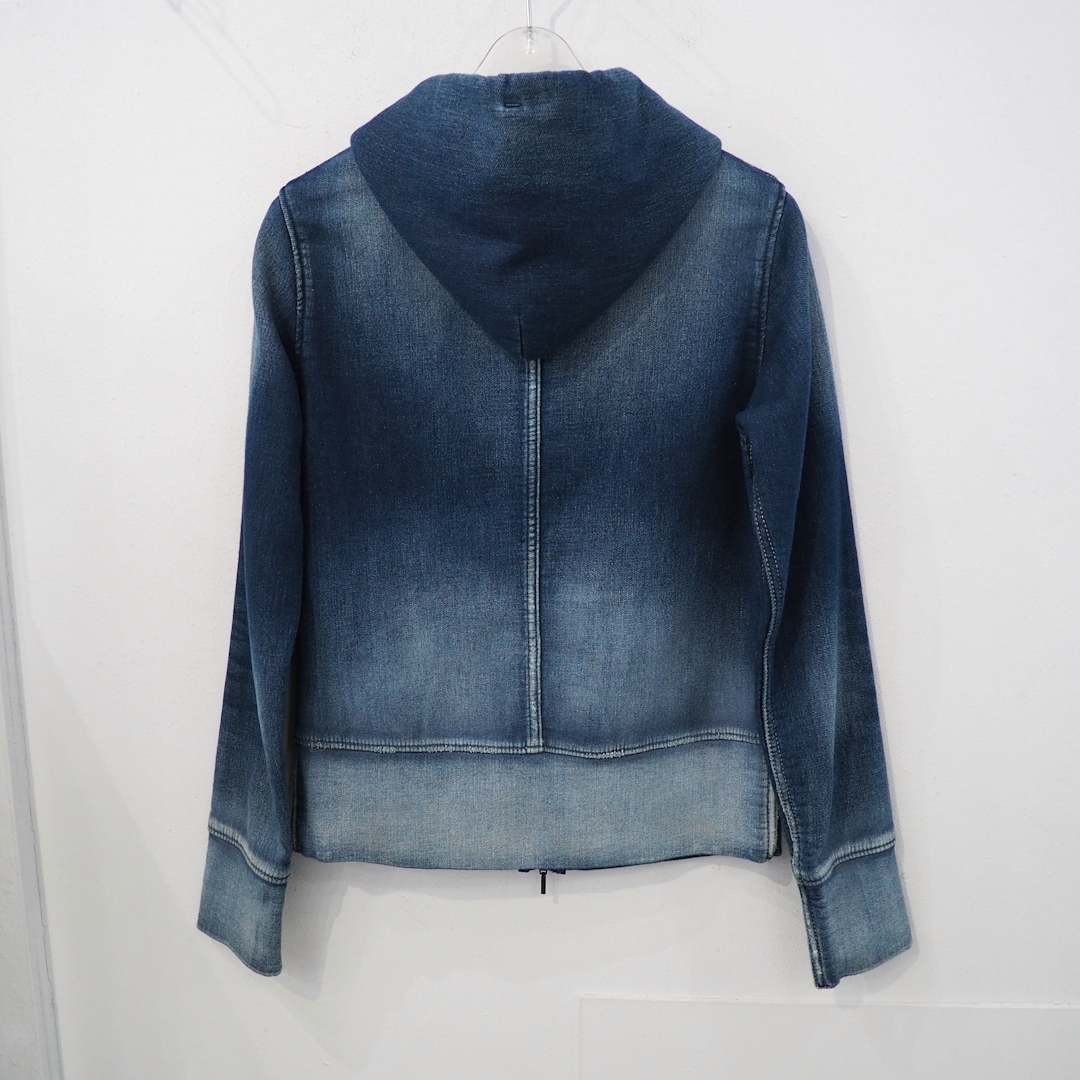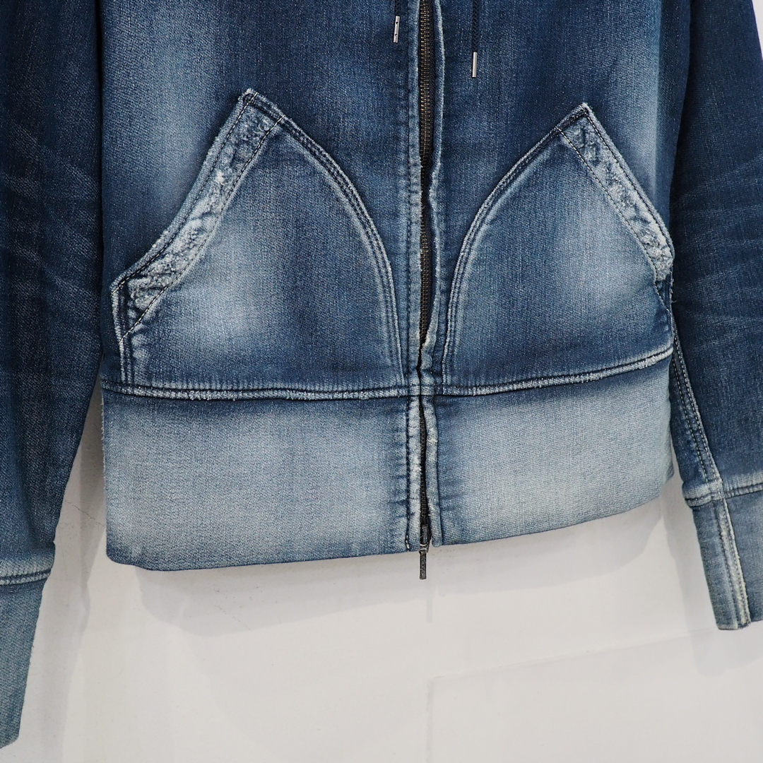 デニムを再現した上質スウェットを使用し、長袖型、ダブルジップ、ウォッシュ&ダメージ加工など、細部まで凝ったデザインです。