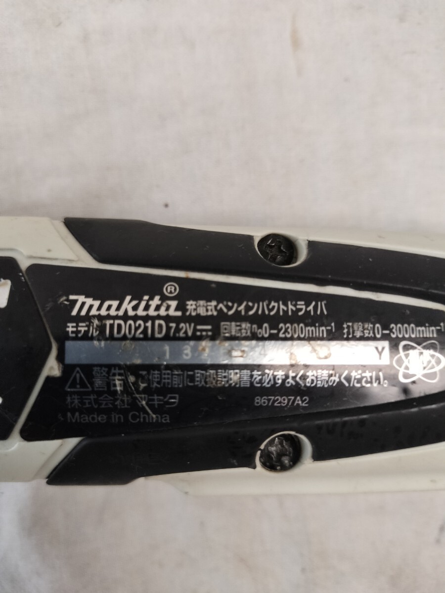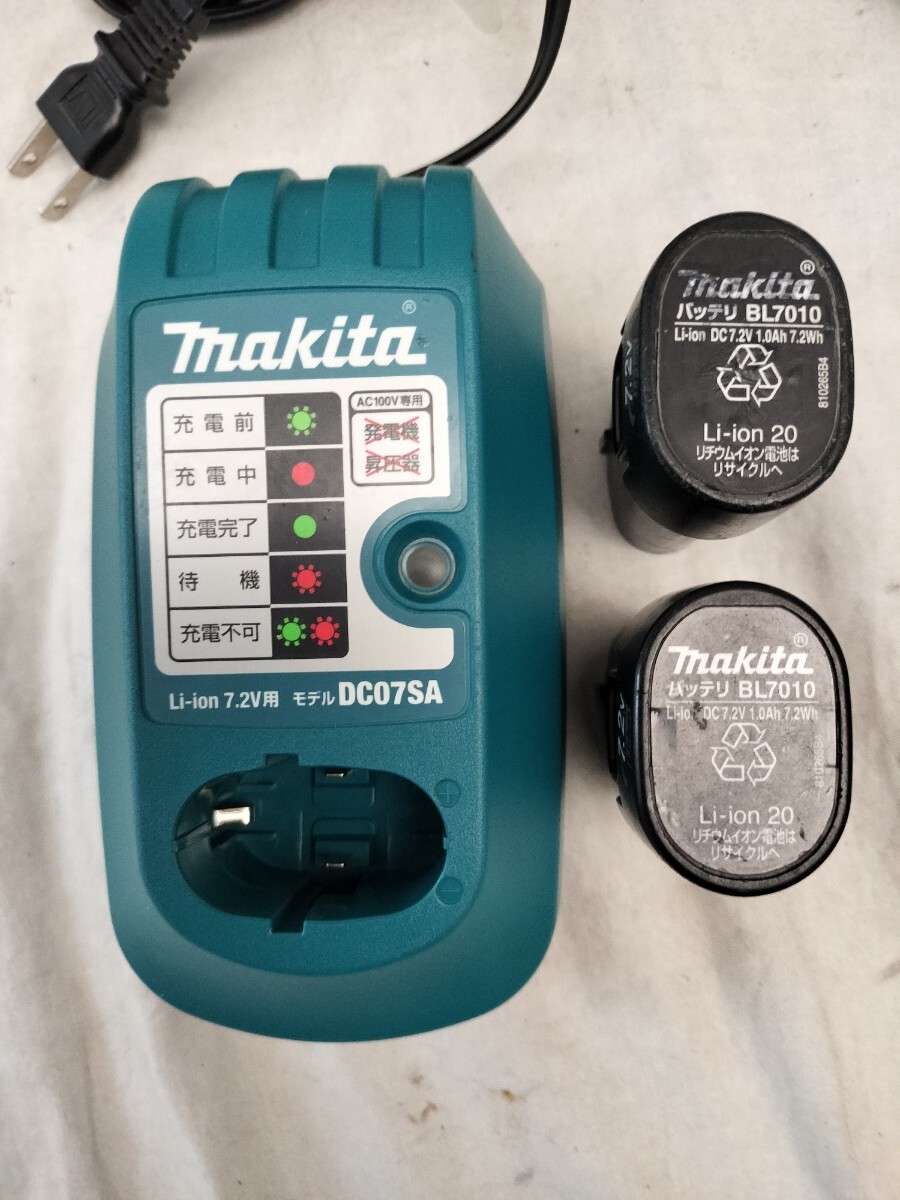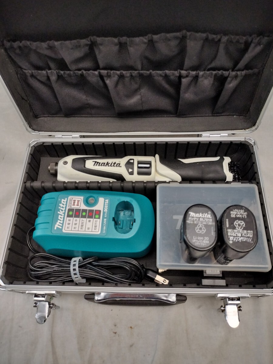 マキタの7.2V充電式ペンインパクトドライバーTD021Dです、使用品ですが状態は良いのでまだまだご使用が出来るドライバーだと思います。充電器DC07SAとバッテリーBL7010が2個も状態は良いと思います。バッテリーは2個とも満充電ができます。小物ケースとアルミケースが付いています。動作は確認済みで。発送はゆうパック着払い80サイズで発送いたします。