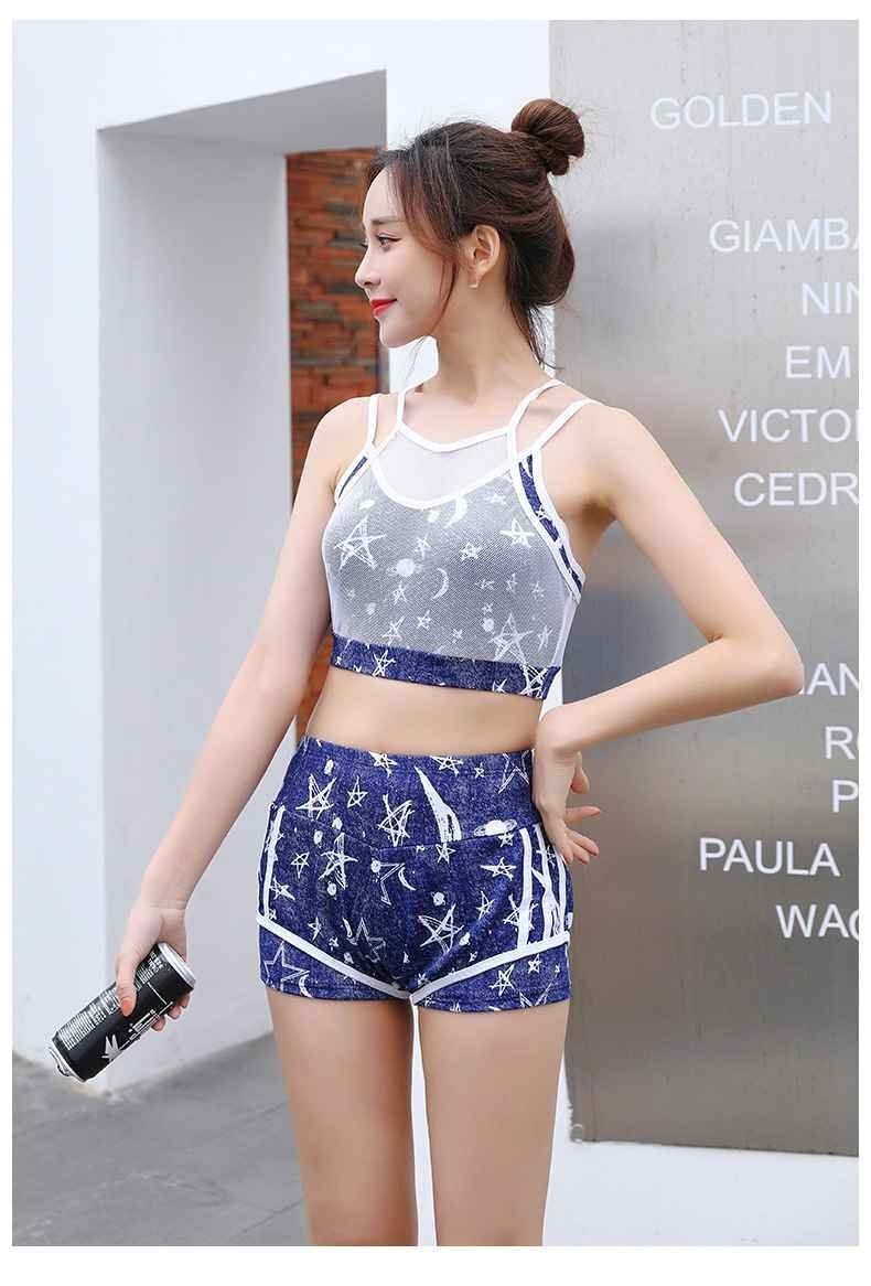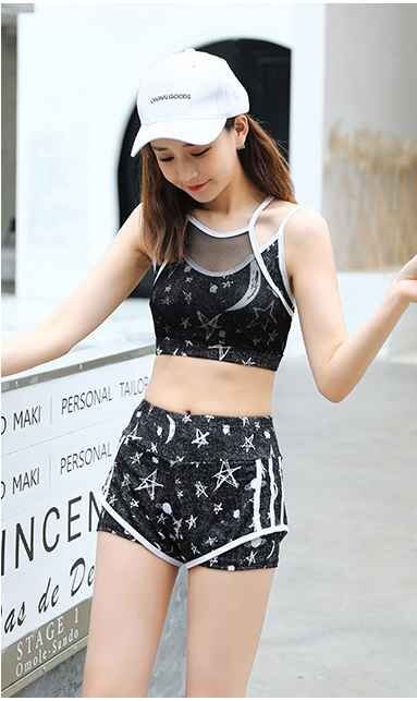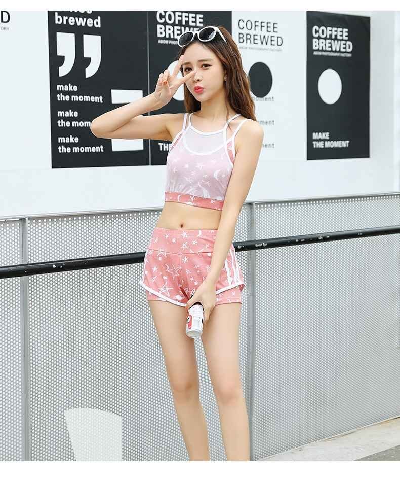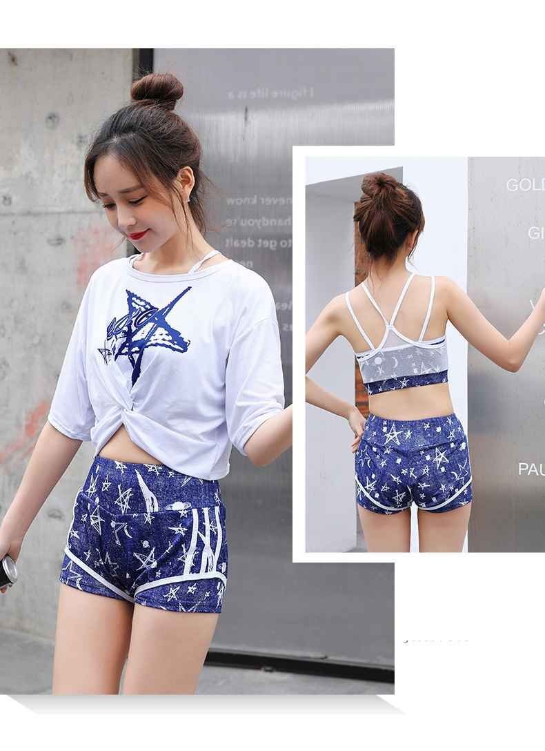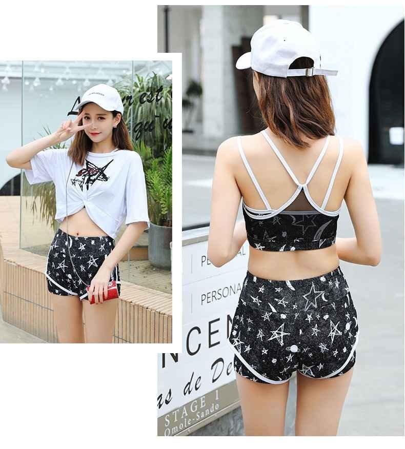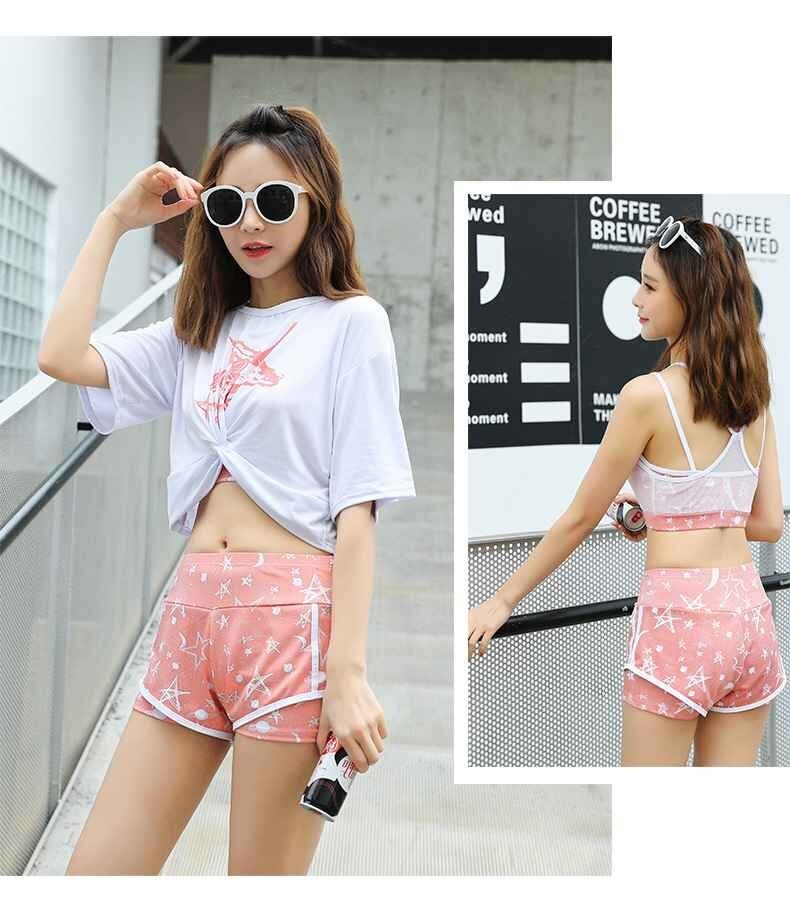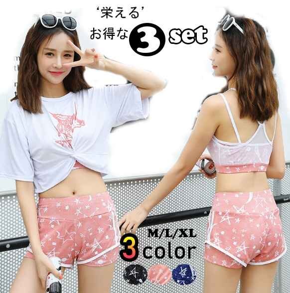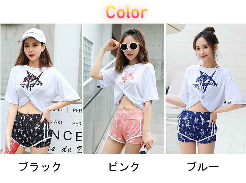 バストラインを綺麗にキープして見せてくれるホルターネックブラ、2重で安心のショートパンツ、デザイナーズTシャツ