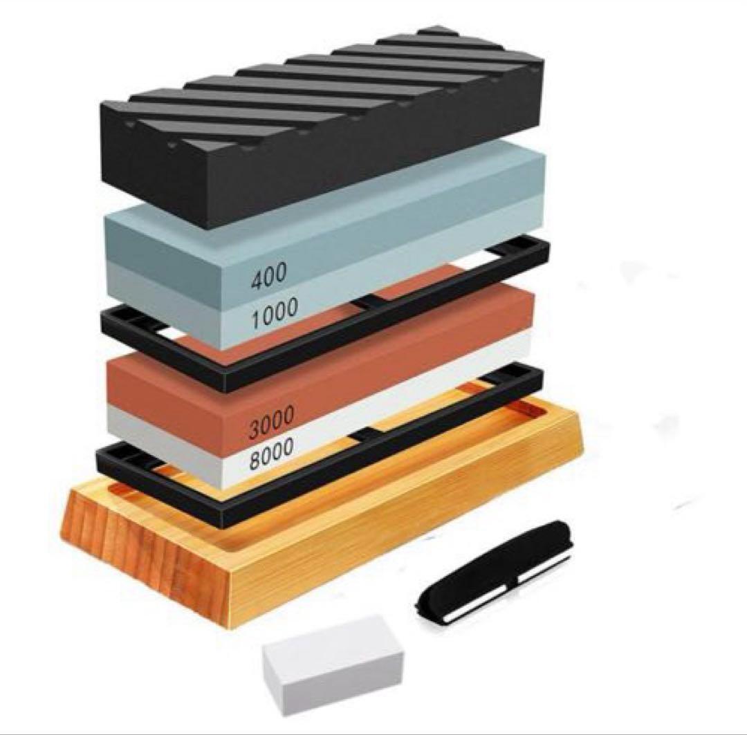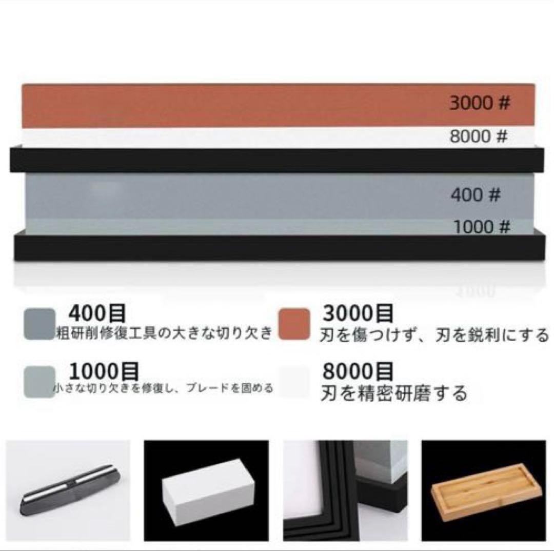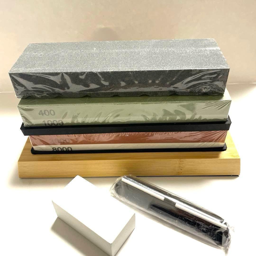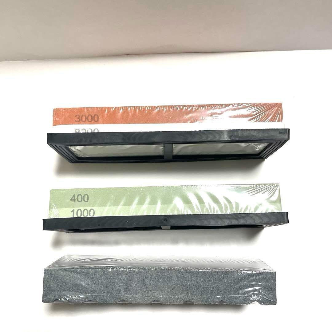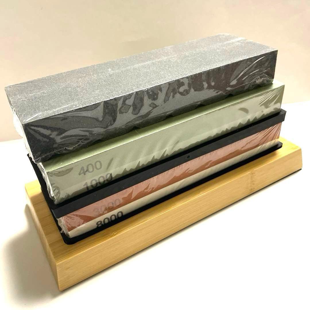 400番(荒砥)・1000番(中砥)・3000番(仕上げ砥)・8000番(超仕上げ砥)の4種類の粒度を揃え、欠けた刃の修正から鋭い切れ味の仕上げまで対応。