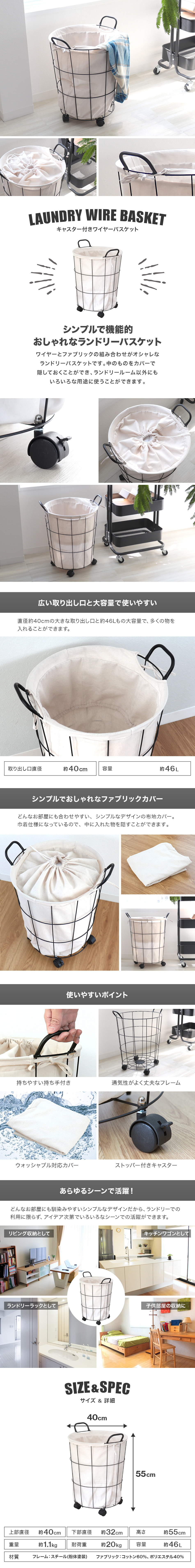 | シンプルで機能的!おしゃれなランドリーバスケットです。 直径約40cmの大きな取り出し口と約46Lの大容量で、 多くのものを収納できます。 ウォッシャブル対応のシンプルな布地カバーはきんちゃく仕様になっているので、 中に入れたものを隠すことができます。 通気性が良く丈夫なフレームは、持ち手・キャスター付きなので、 ラックごとの移動もスムーズです。 ランドリー以外にキッチンの食品ストッカー、リビングの雑貨入れ、おもちゃ収納にも使えます! カラーホワイト サイズ(約)上部直径40×下部直径32×高さ55cm 重量(約)1.1kg 容量(約)46L 耐荷重(約)20kg 素材フレーム:スチール(粉体塗装) ファブリック:コットン60%、ポリエステル40% 保証期間7日間 ※商品到着後7日以内の初期不良・破損のみご対応させていただきます。 注意事項・お客様組み立てになります。 ・スチール製の為、浴室ではご使用いただけません。 ・商品は、モニターによって色合いが異なって見える場合があります。 ・仕様・デザインは改良のため予告なく変更することがあります。 |