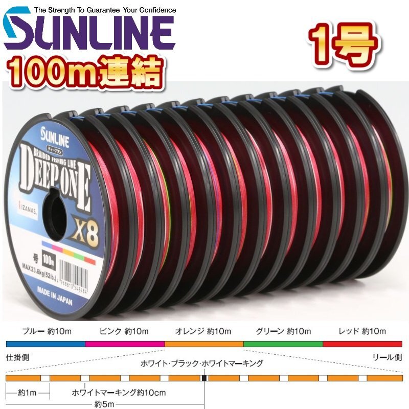 サンライン 1号(21LB) ディープワン×8 100m連結 5色分け マルチカラー 日本製 国産8本組PEライン DEEP ONE x8