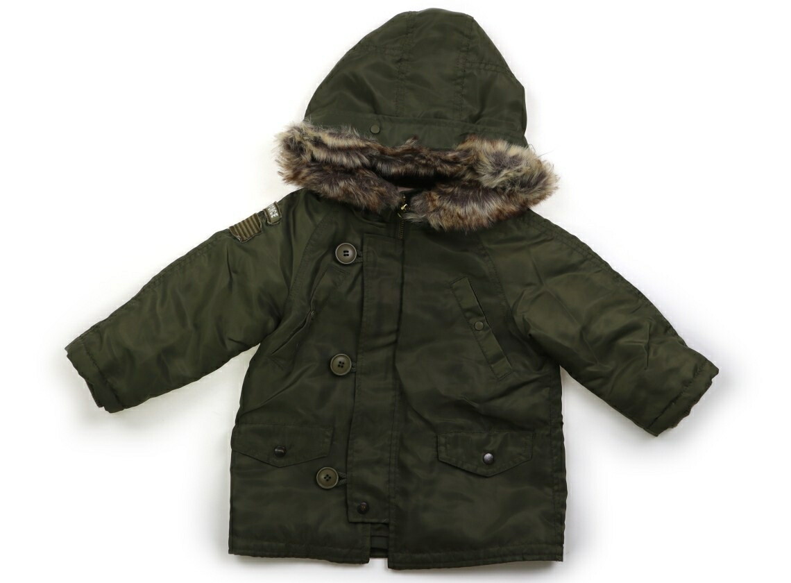 ポリエステル素材で、中綿入り。フードは縫い付けで、フェイクファーのみ取り外し可能です。スナップボタンに色の剥がれ・袖に広範囲で、黒いシミが多数あり目立ちます。外遊び用にいかがでしょうか。