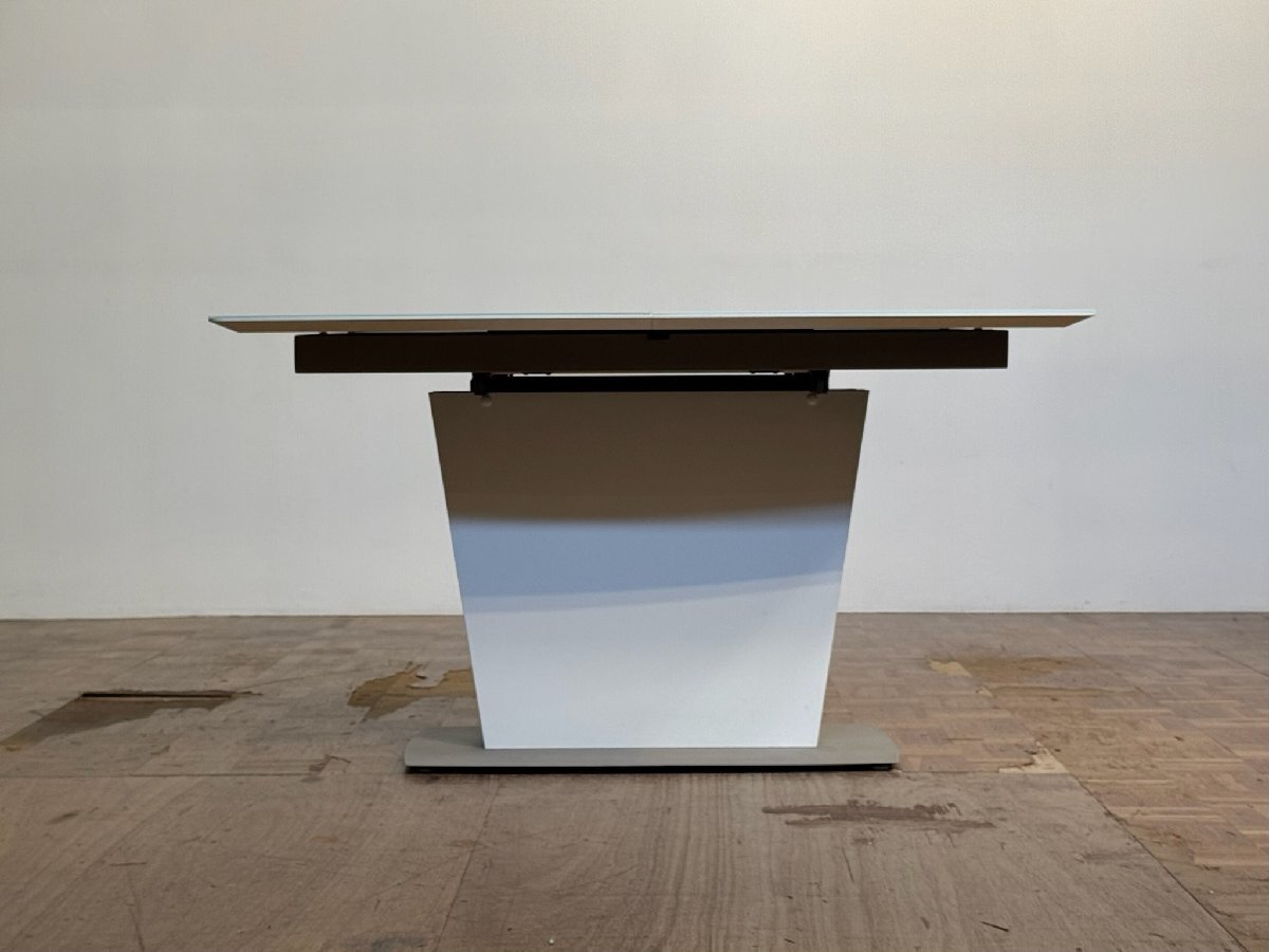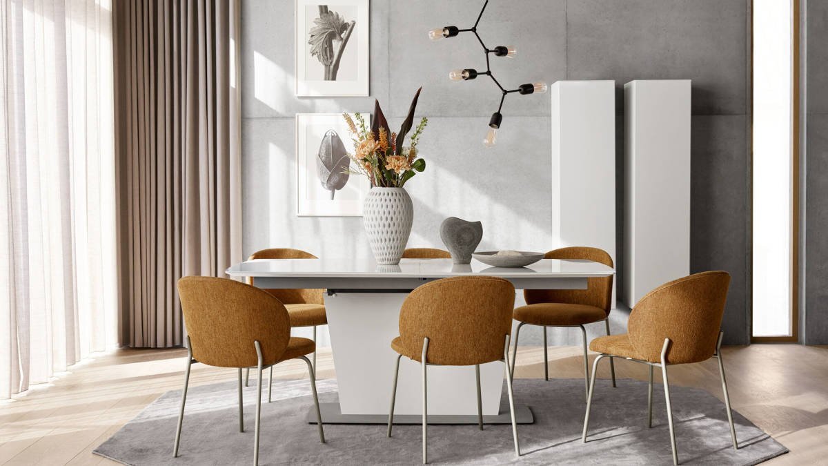 スリムでまろやかな天板のカットラインの美しさと、すっきりとしたデザインながらインテリアを彩る面の要素としてホワイトバックのガラスの艶感とマットホワイトのコントラストを配色した BoConcept / ボーコンセプトの不朽の名作ダイニングテーブル。BoConcept より。