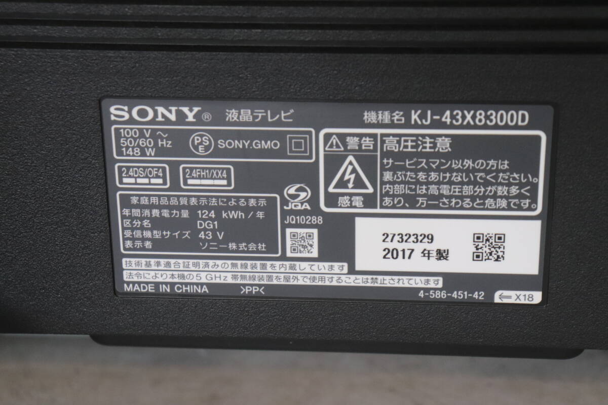 YKB/T11 SONY ソニー BRAVIA KJ-43X8300D 43型 液晶 テレビ 2017年製 地上デジタル放送視聴可能 現状品 直接引き取り歓迎 | |||
