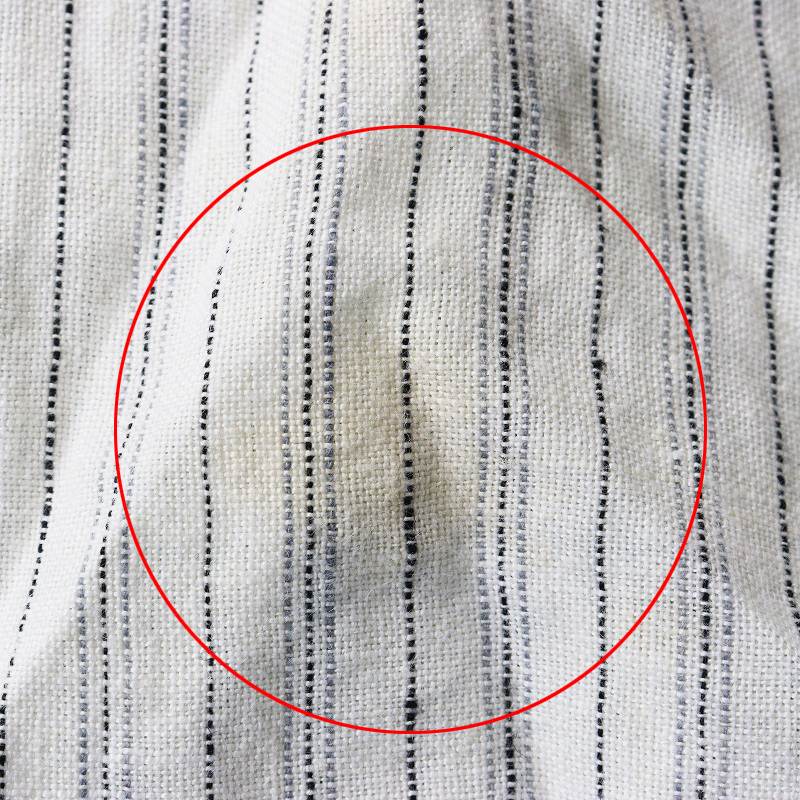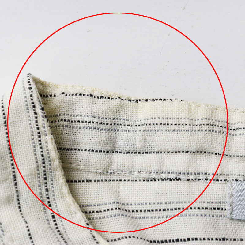 首元・脇下に黄ばみ、バック上部・フロント中央から裾にかけて複数のシミが見受けられます。