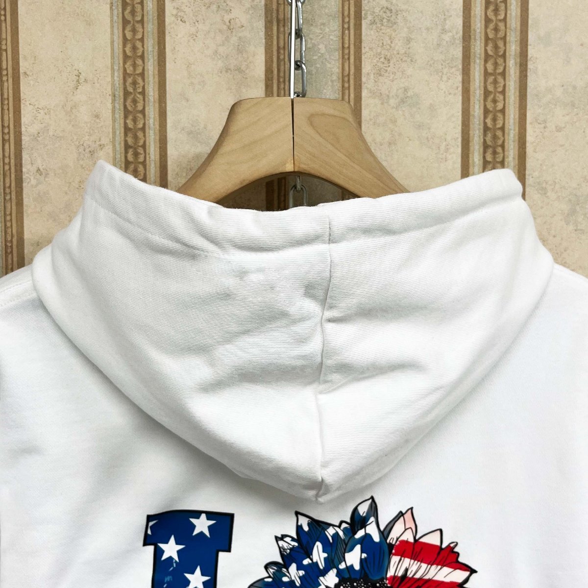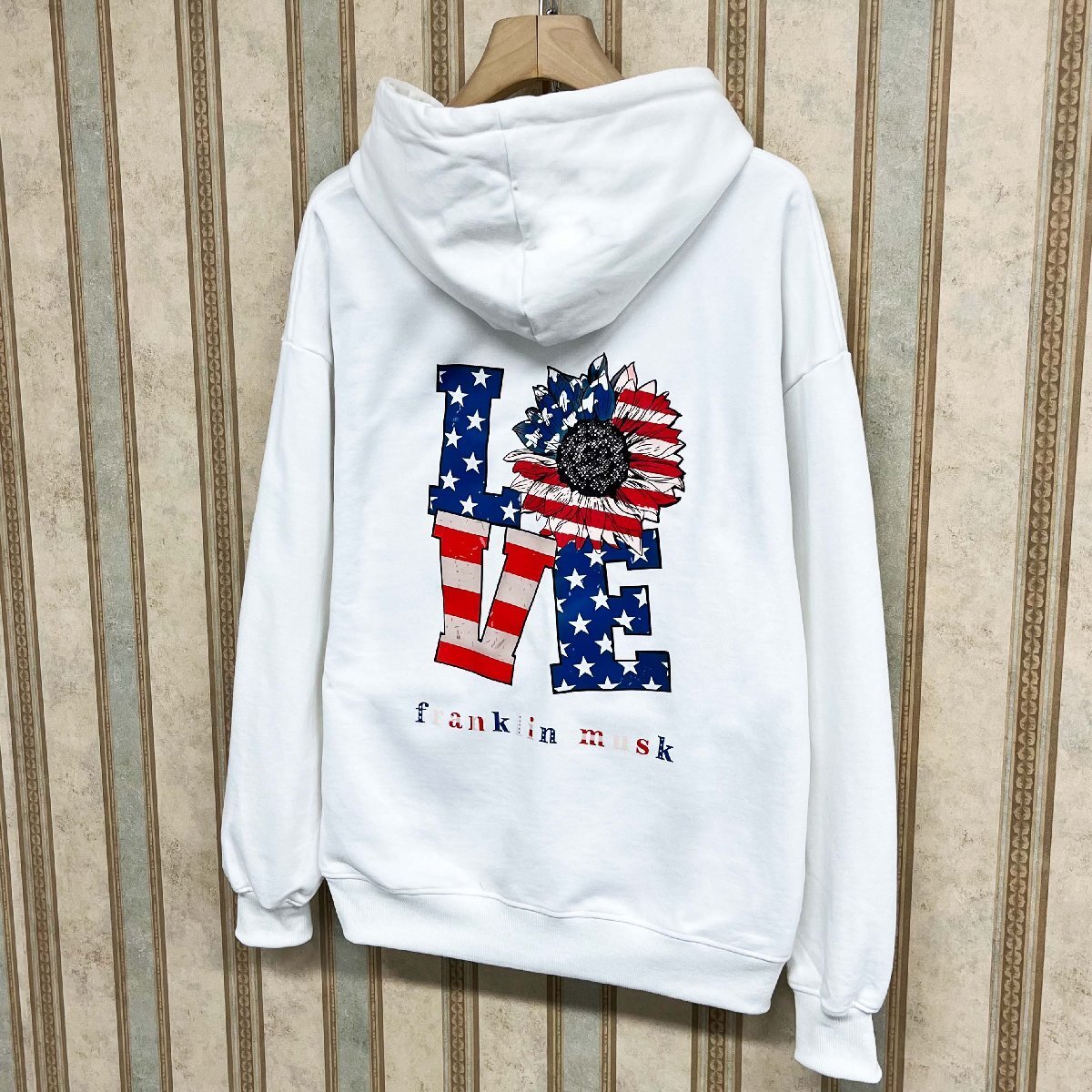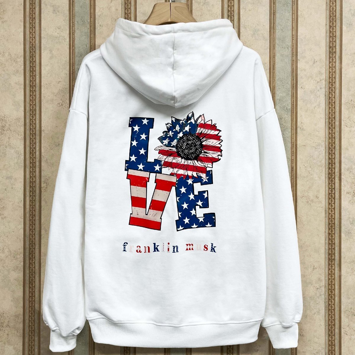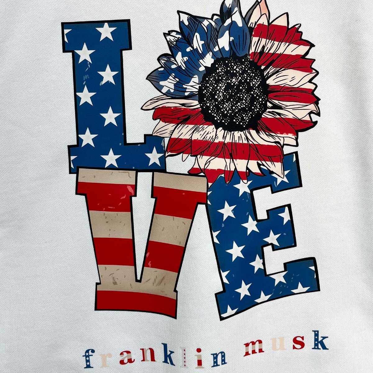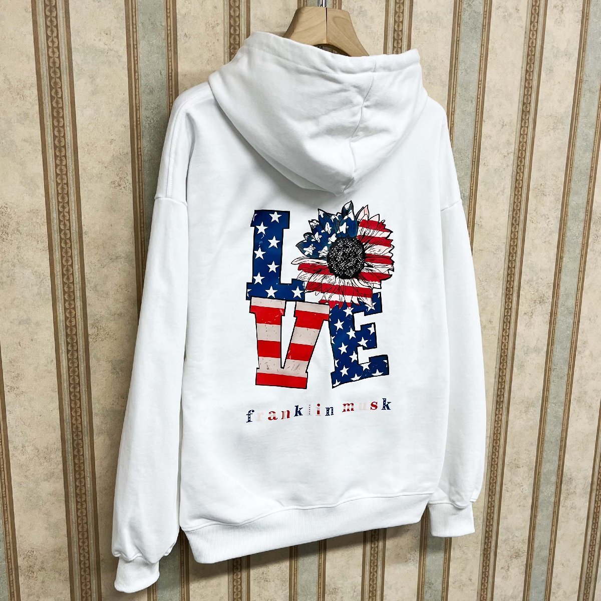 ゆったりとしたクラシックシルエットで体型を選ばず、胸元にさりげなく配置された英文がアクセントに。背面には“LOVE”の文字と、アメリカ国旗、ひまわりのモチーフを組み合わせたデザインが描かれています。自由と希望を象徴する一着です。一枚で二つの表情を楽しめる逸品です。