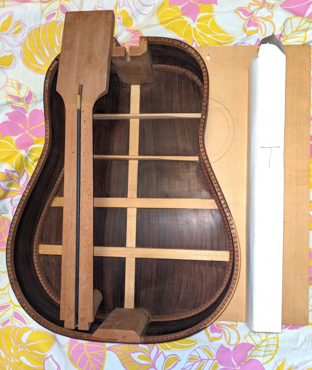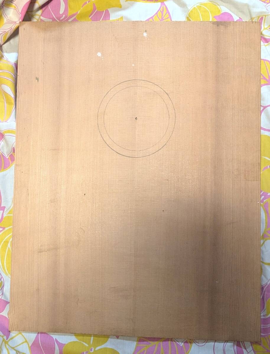 ・トップ:3Aイングルマンスプルース(550xx430x4mm)+ブレーシング ※下書き、サウンドホールセンター穴あけ)