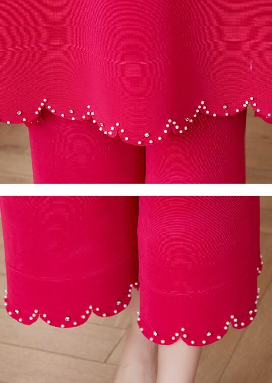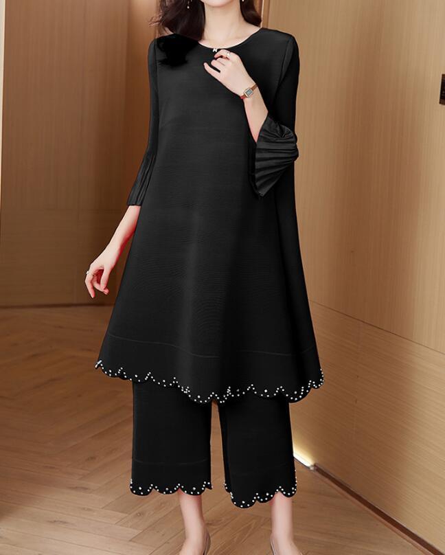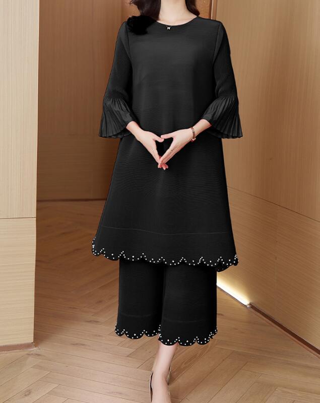 レディーストップス プリーツワンピースワンピワイドパンツ2点セット 肌触り弾力通気性ドレープ性いい 素敵精美ビーズ飾りアイボリー*黒