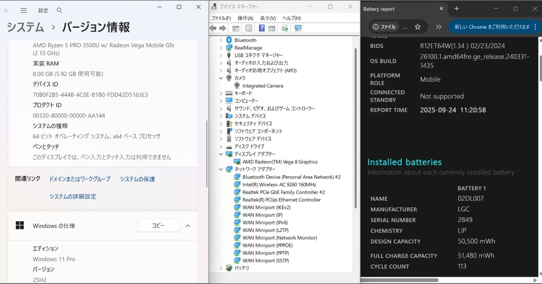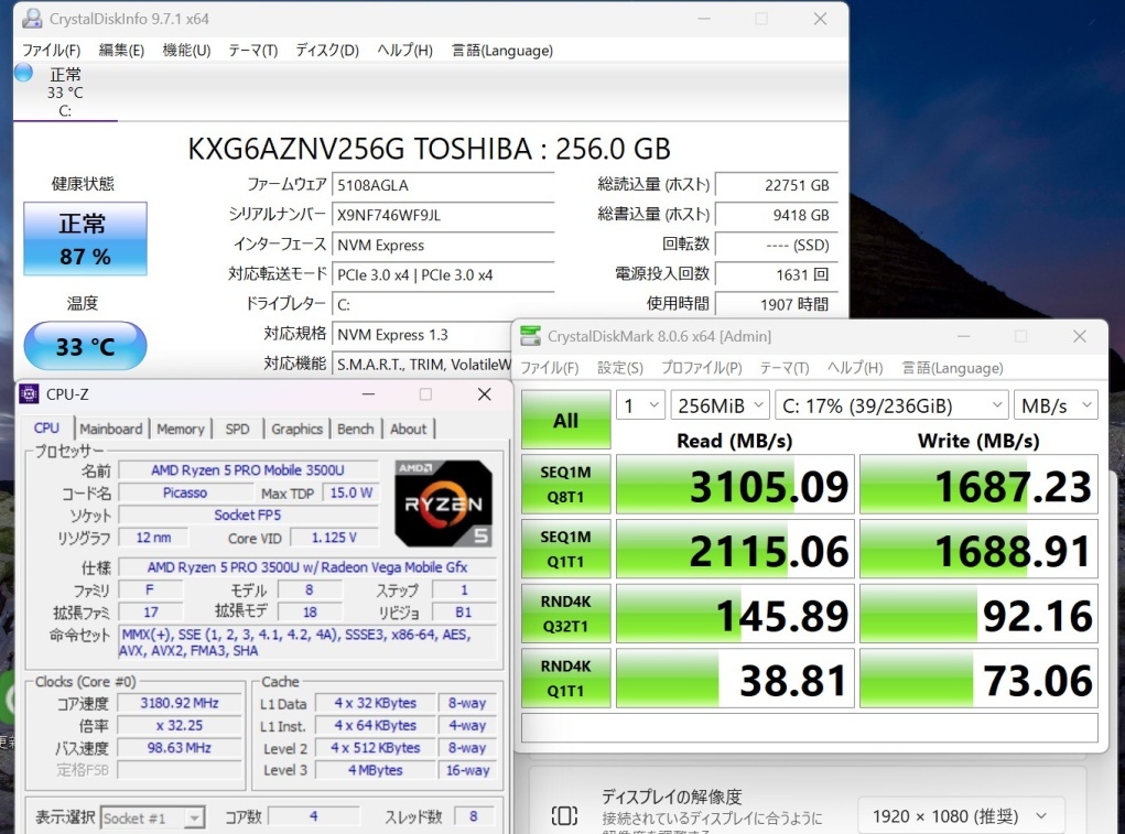 | CPU: 高速 AMD Ryzen 5 PRO 3500U 2.1Ghz、 4コア8スレッド (ターボ・ブースト利用時の最大周波数 3.7GHz) |