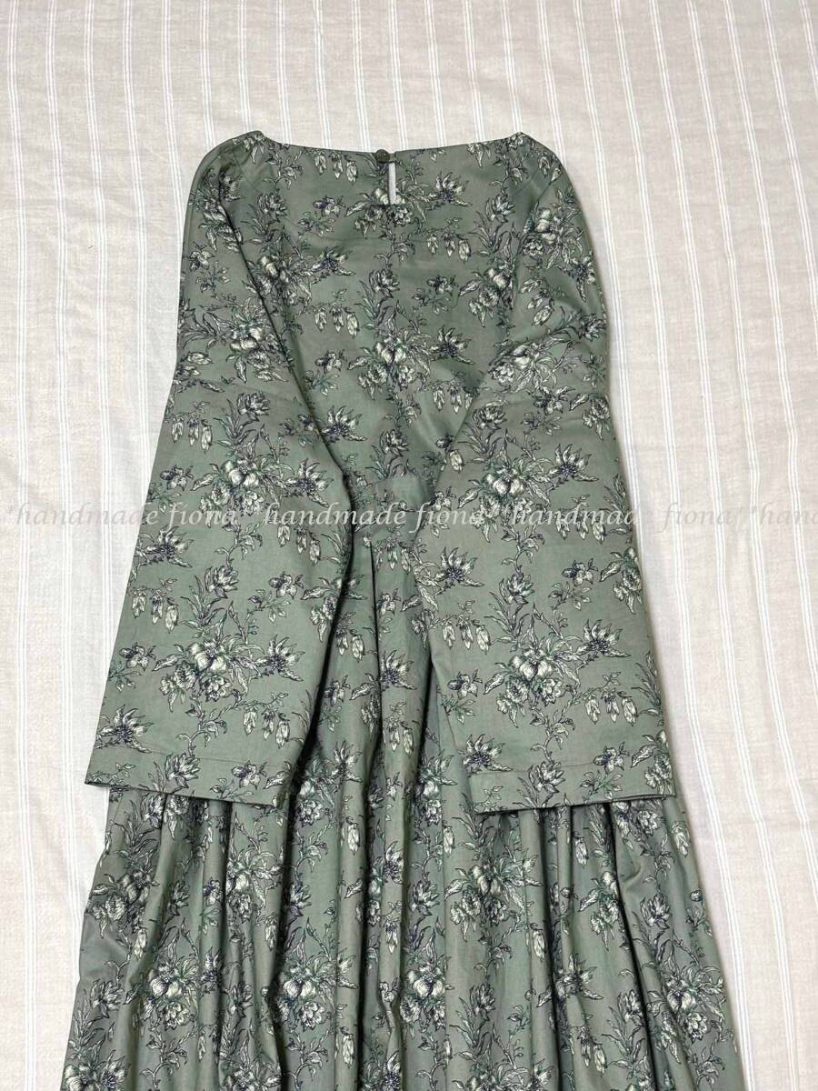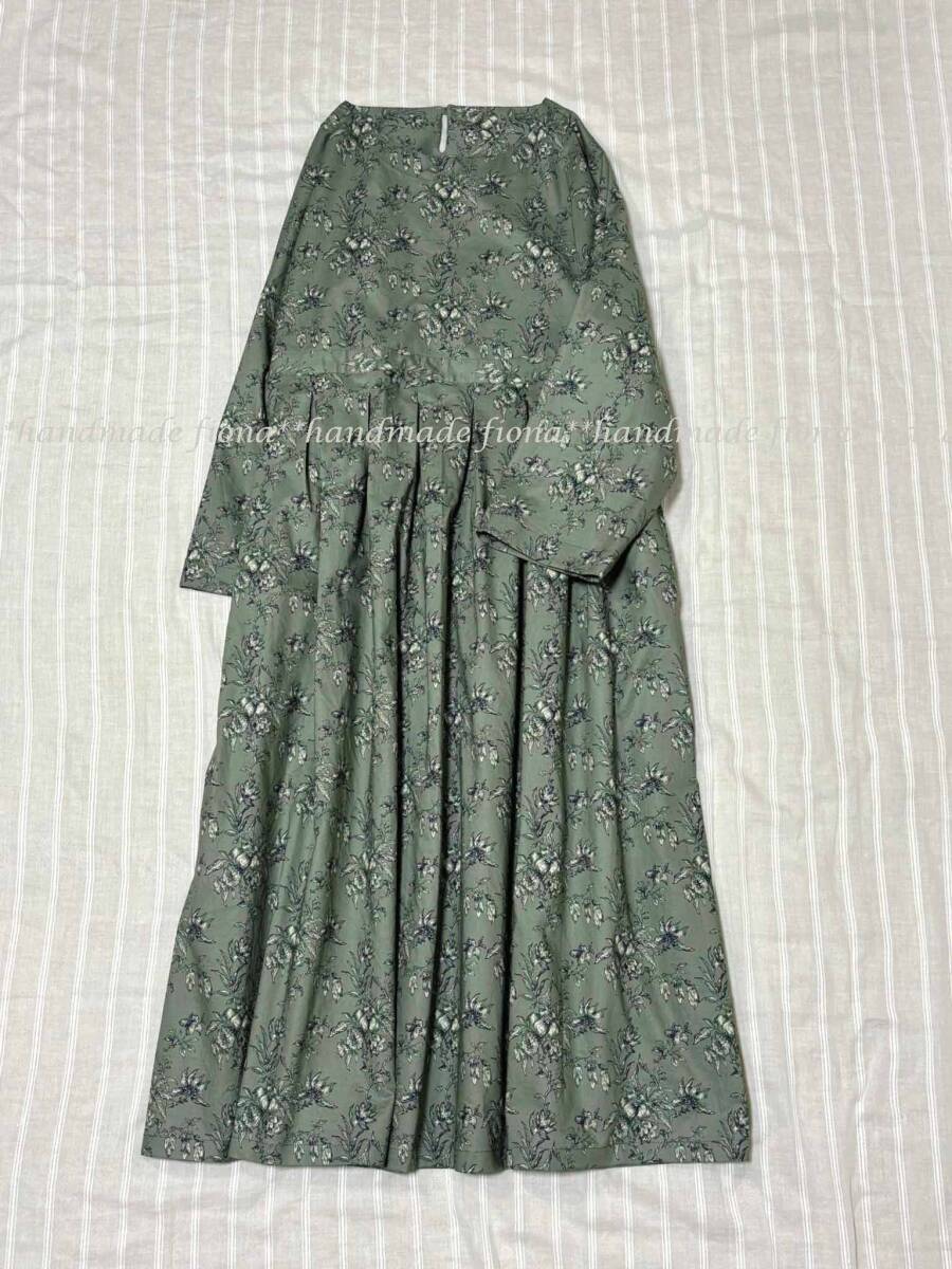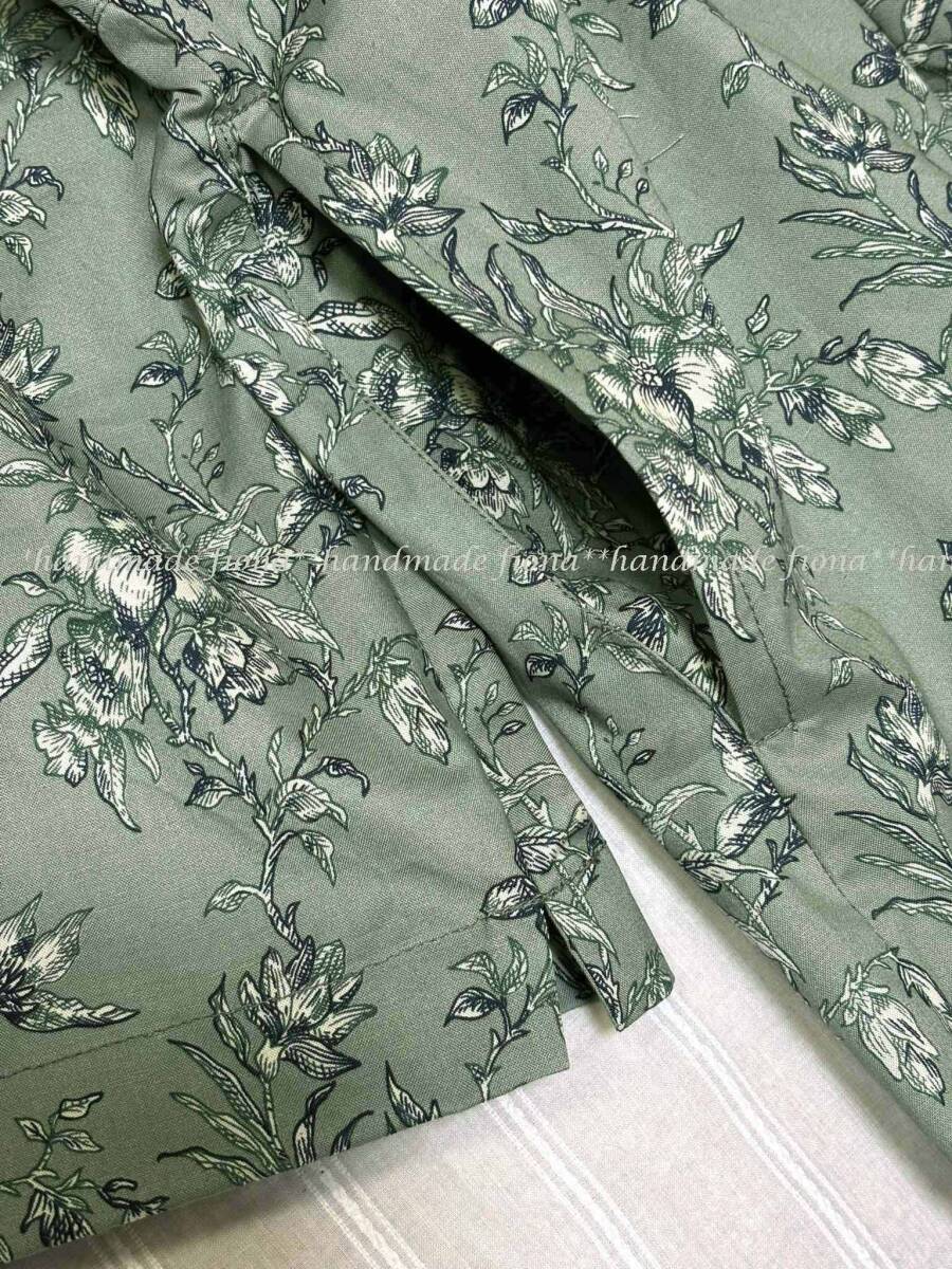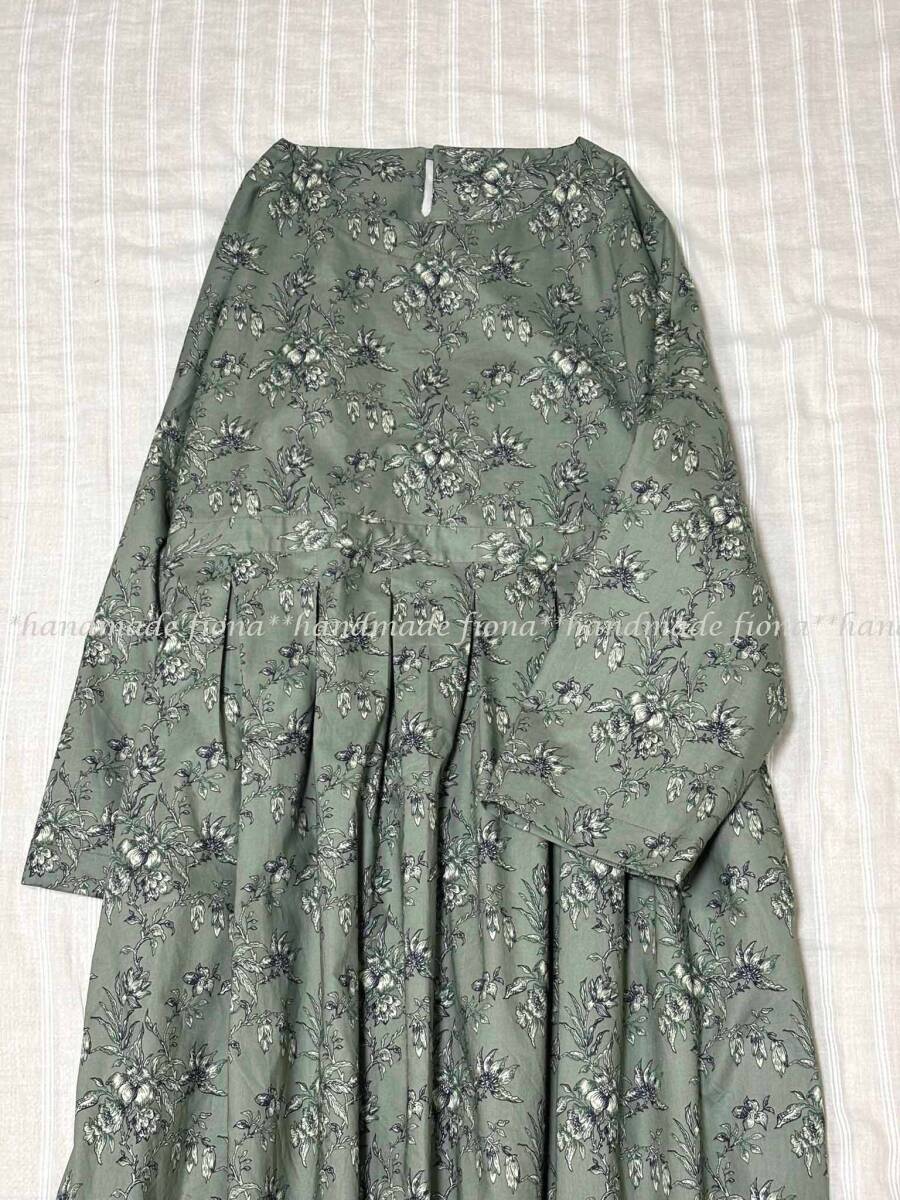 *:. ハンドメイド cotton 線画flower アッシュグリーン タックOP .:*