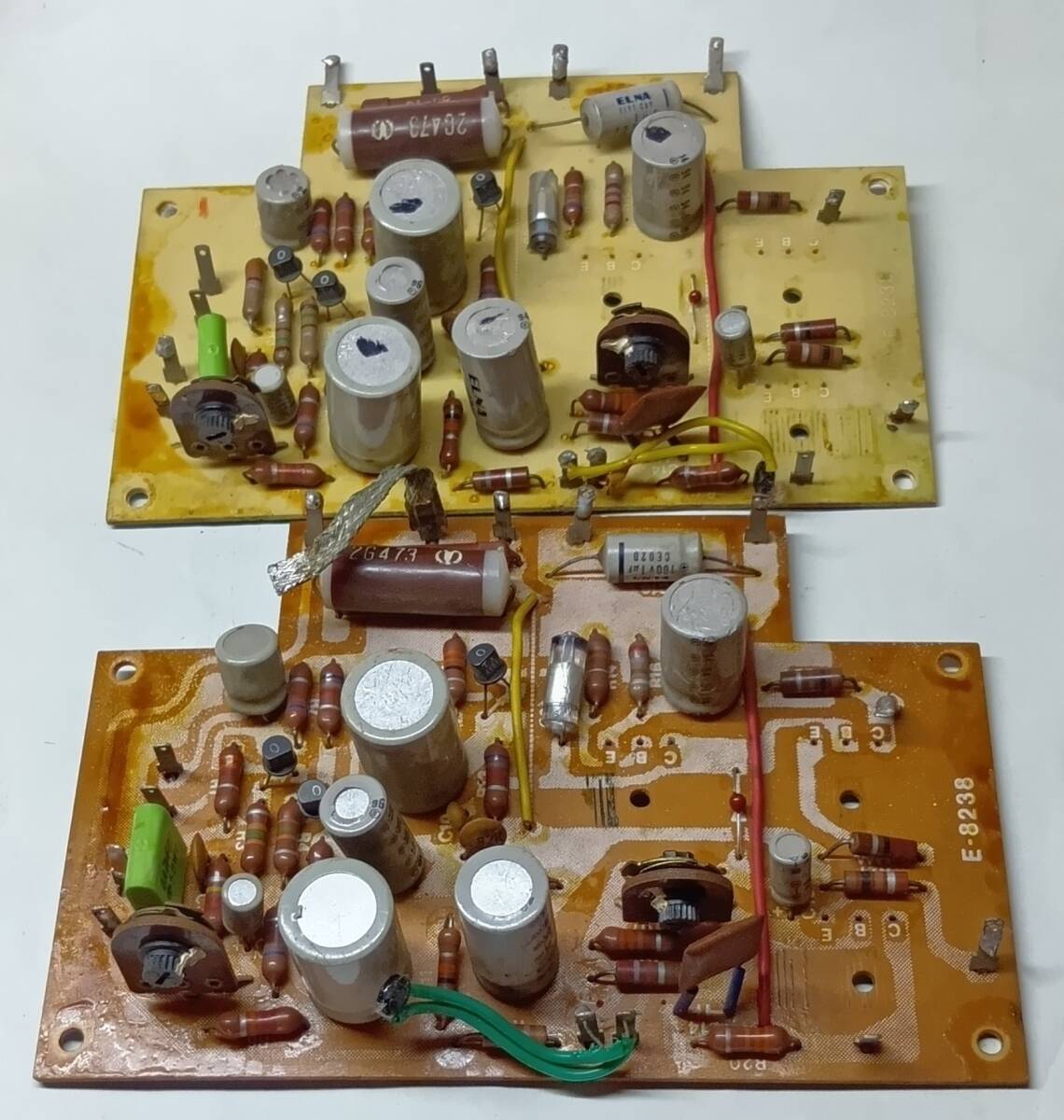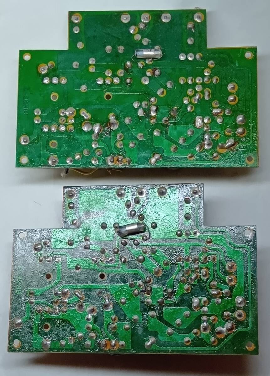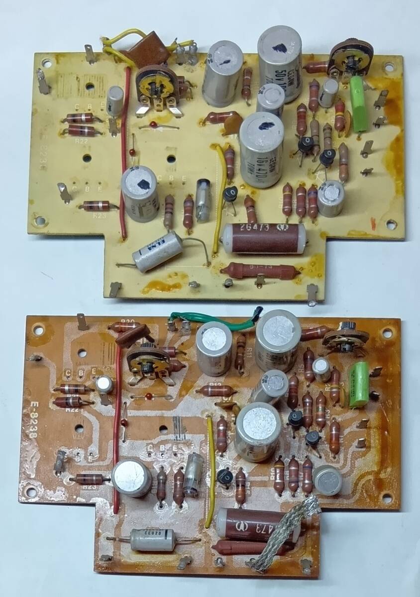 基板の色が異なりますが同一セット取外し品です。回路図はありませんが初段差動→シングル2段目→ドライバ段迄の当時標準的なシンプル回路ですので多少慣れた方なら図面起しの必要も無いと思います。その時代の最高出力級ですので同社製プリメインアンプ高級機と共通基板かもしれません。