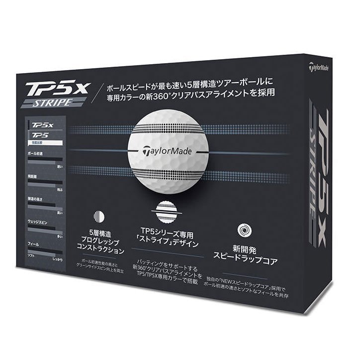 商品説明 | 新発売『TP5 Stripe』ボール。 この打感でこの飛距離。新『TP5/TP5x』が、あなたの14本を覚醒させる。 ソフトで心地いいサウンドと、圧倒的なボール初速を実現する、新スピードラップコアを搭載。 ティーショットからセカンドショット、アプローチ、パッティングでも。 進化した『TP5/TP5x』は、きっとあなたを覚醒させる。 5層構造のツアーボール性能に、パッティング時のアライメントをサポートする「360°クリアパスアライメント」を搭載。 ツアープロや上級者が好むクリーンなデザインの『TP5 ストライプ』ボールが登場。 |