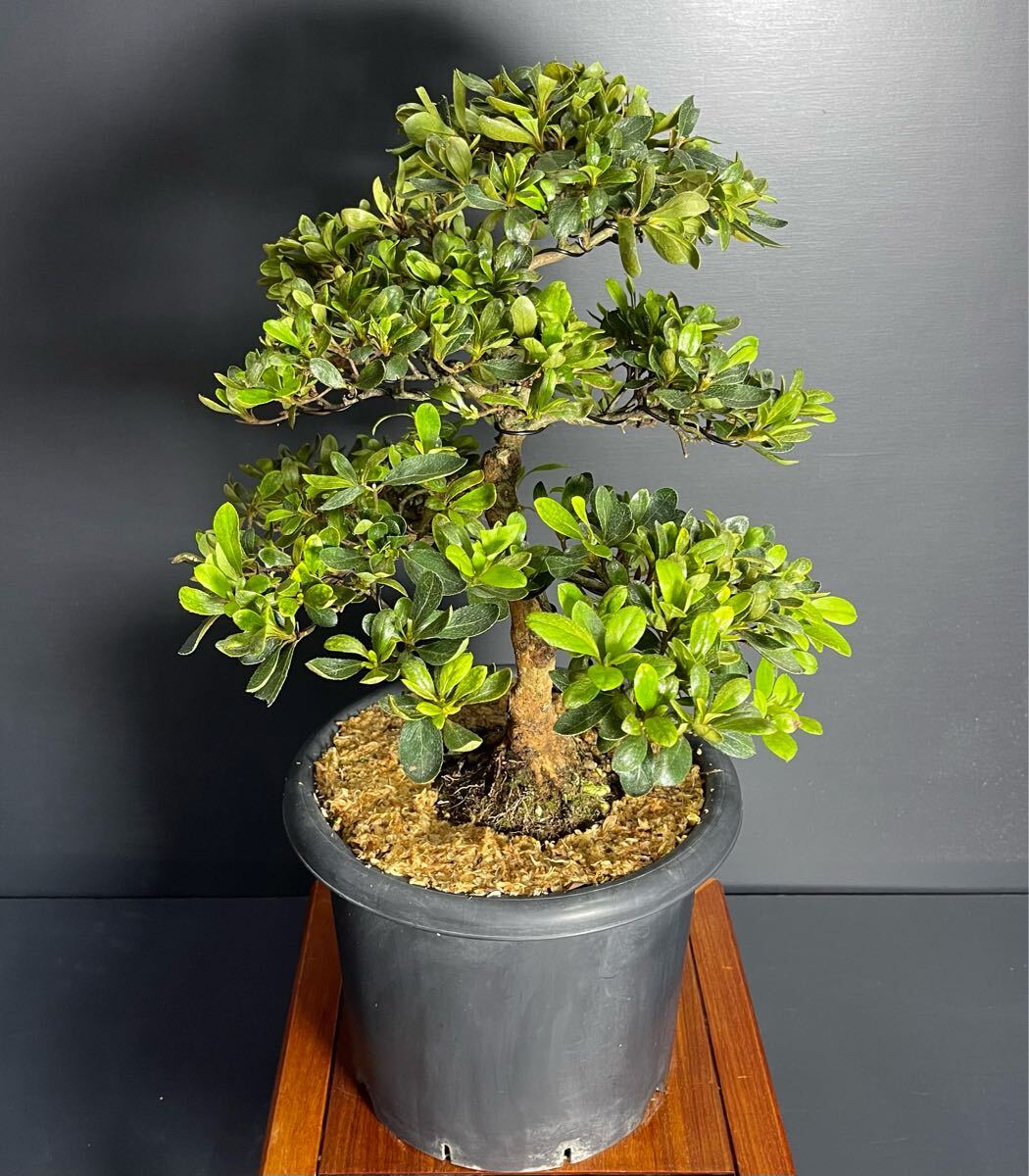 皐月「花月かげつ」は、白地に紅の覆輪が映える清雅な花を咲かせる品種です。本品は小品模様木仕立てで、枝張り均整が取れ、端正で伸びやかな樹姿が魅力。芽吹きから花期まで四季折々の趣を楽しめます。