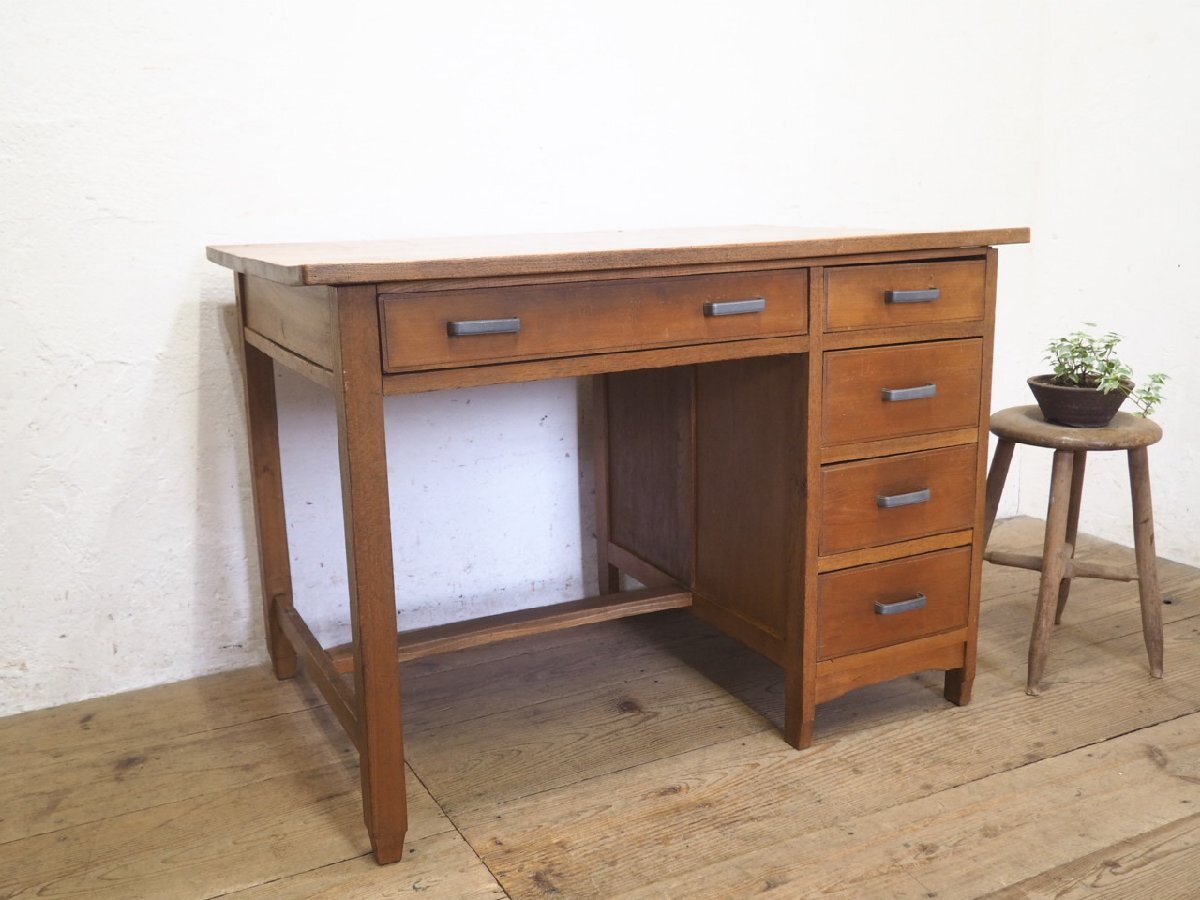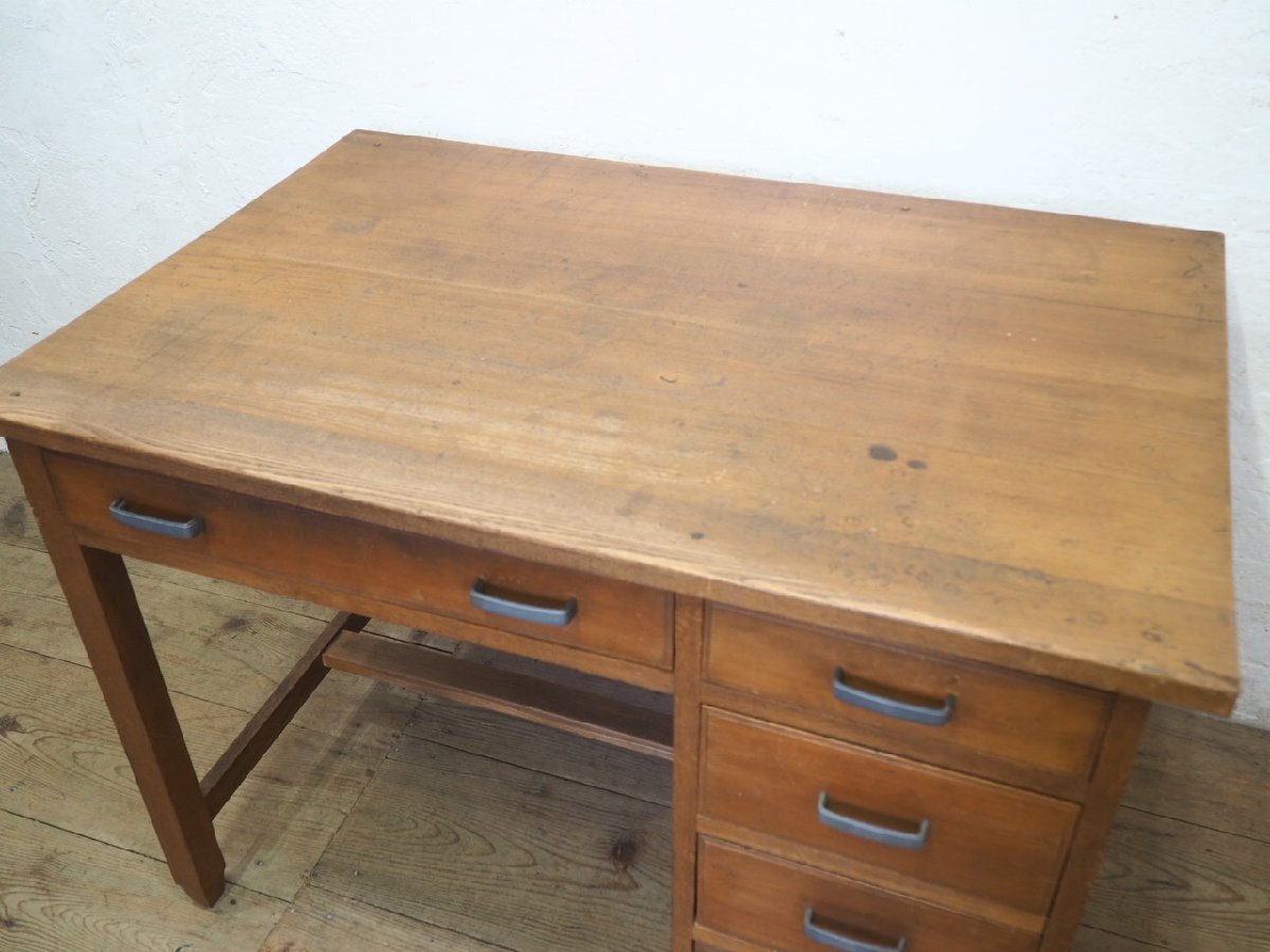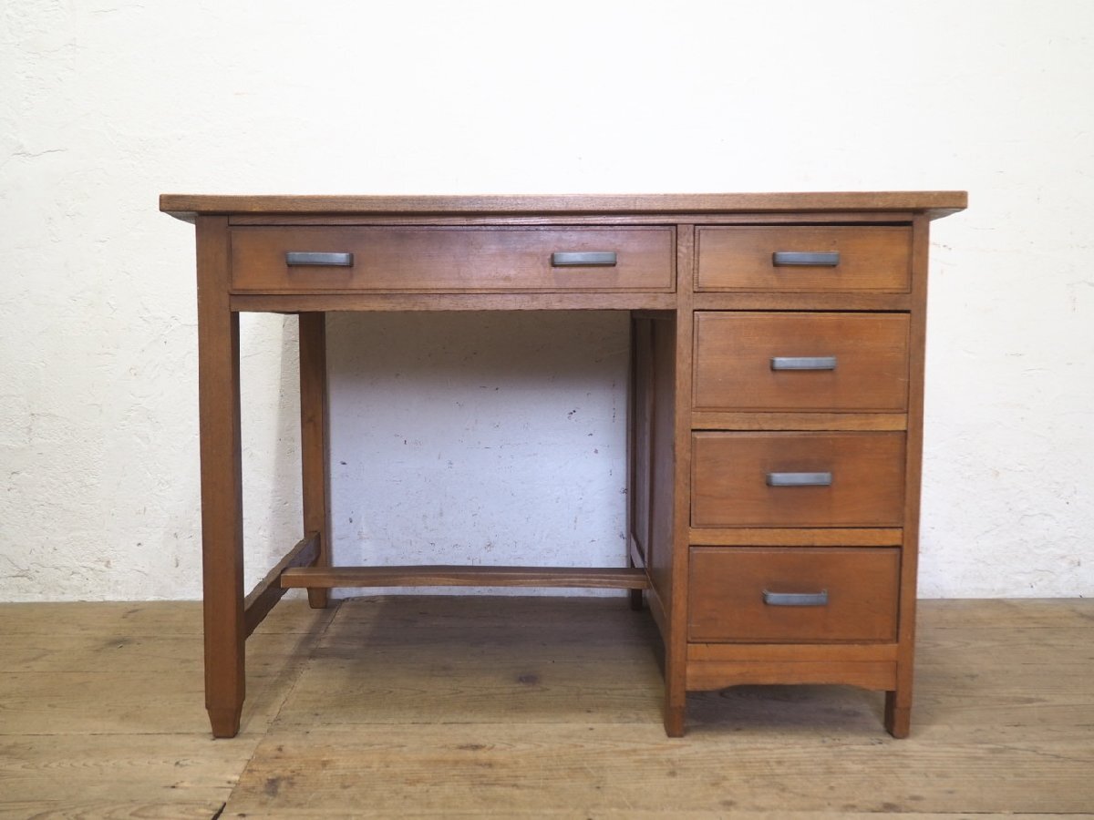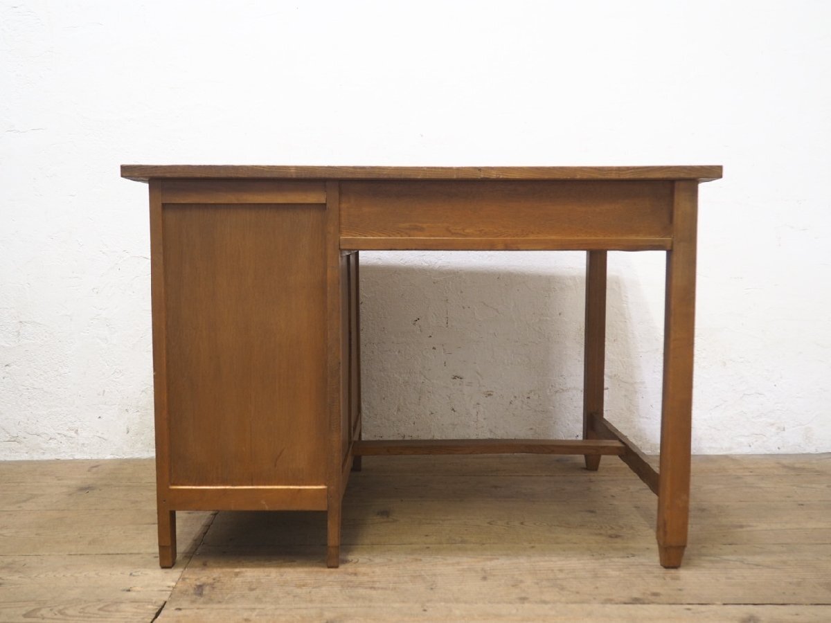 タ荷H0411◆天板W106cm×D71cm◆ナラ材のレトロな古い木製片袖机◆楢 学習机 収納棚 飾り棚 展示台 デスク テーブル ビンテージQ(ヤD)松