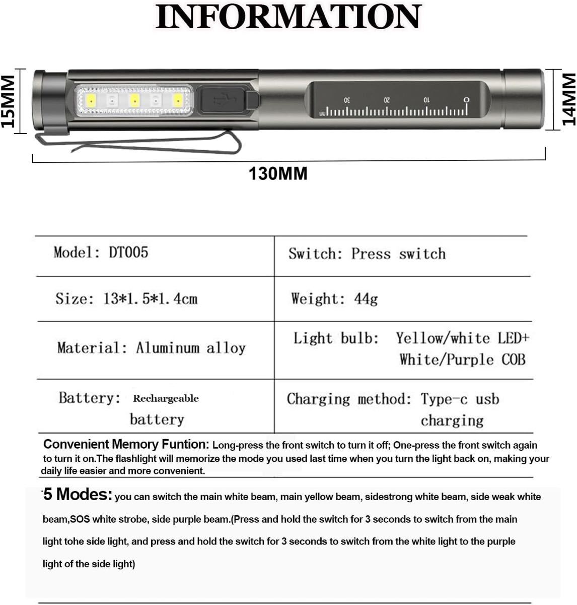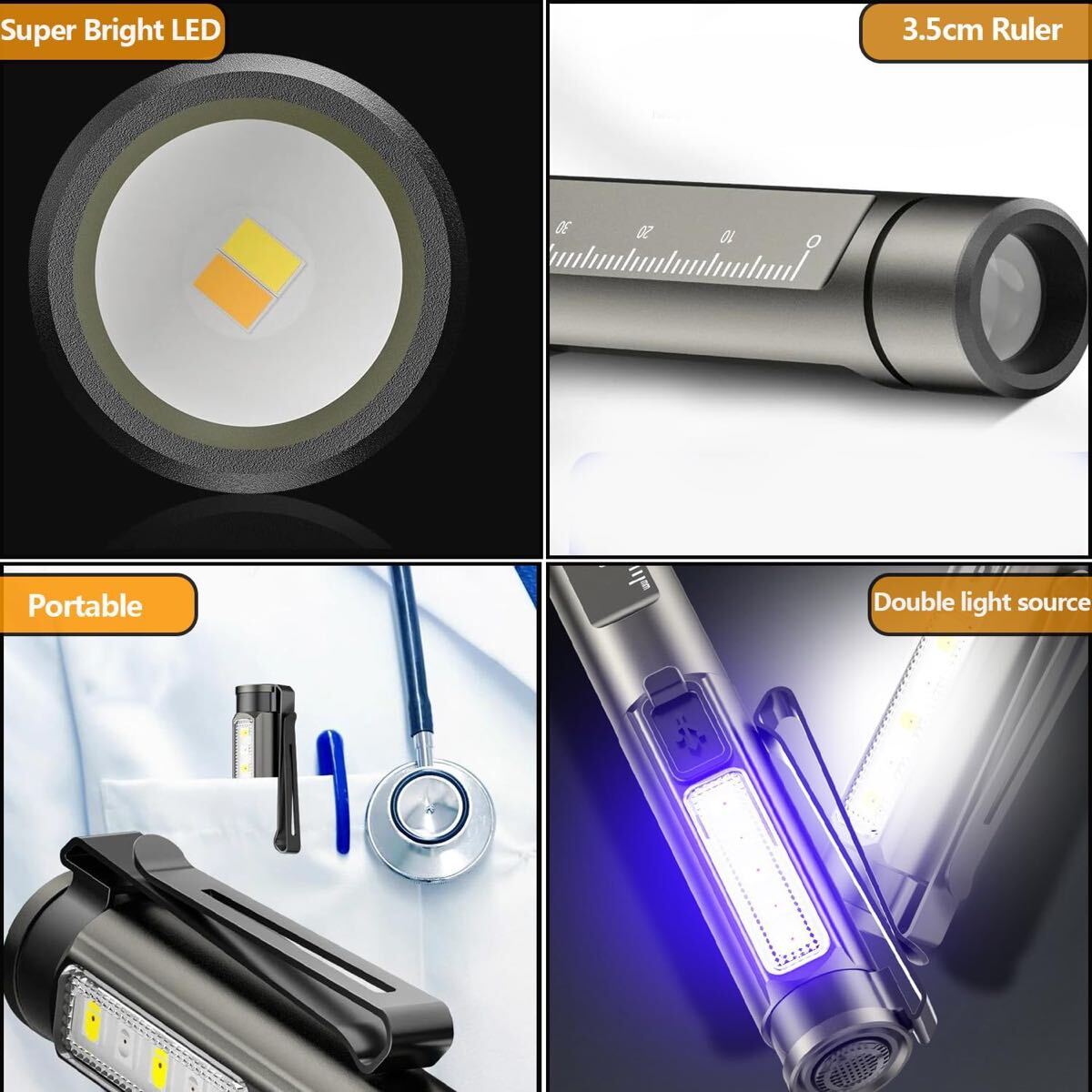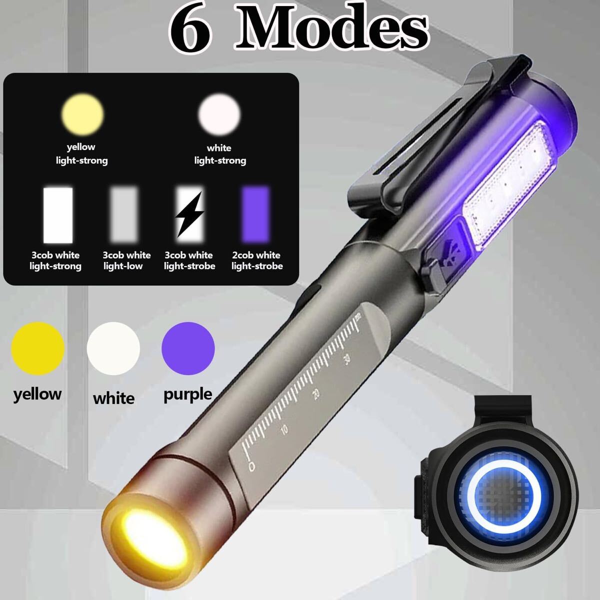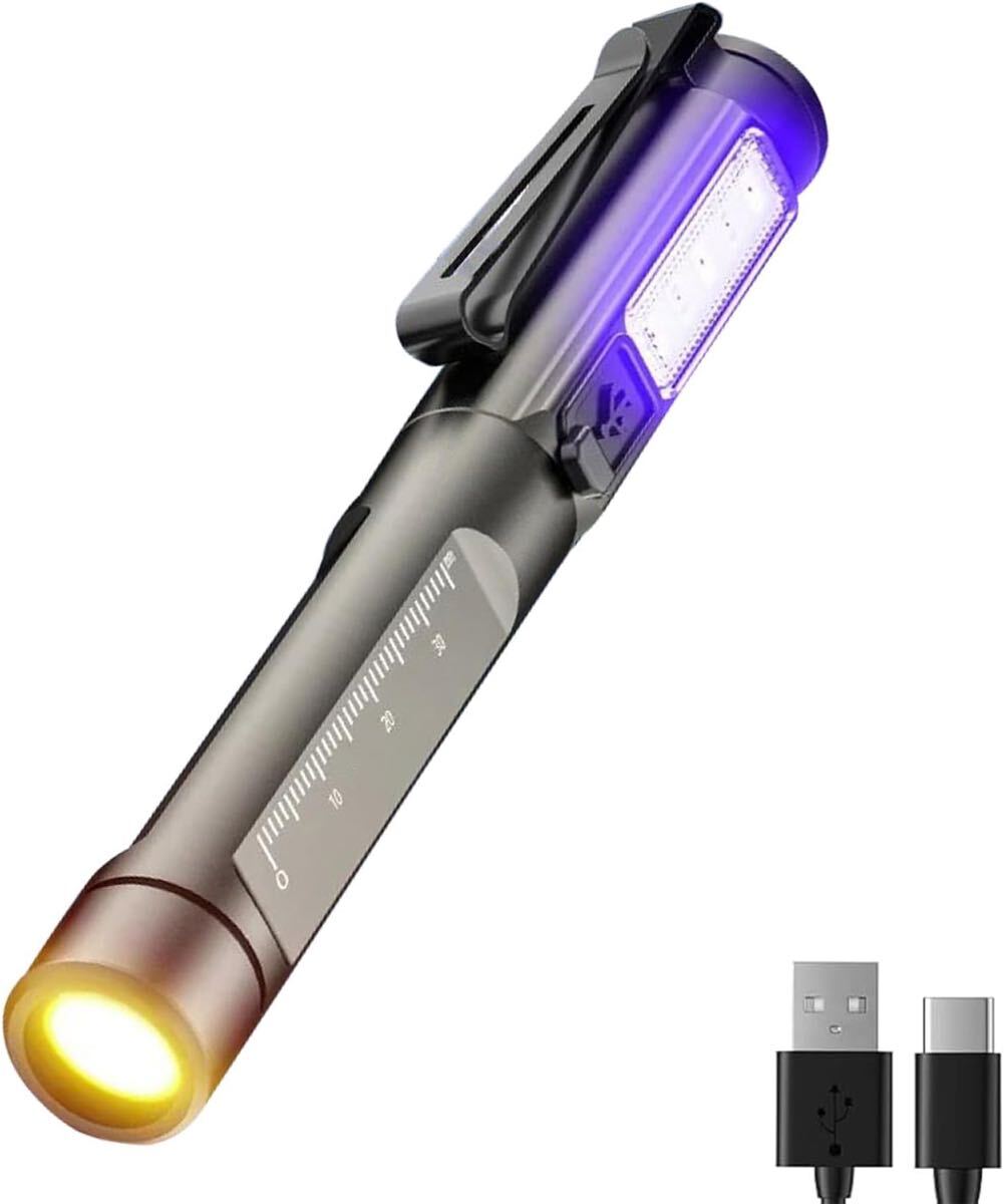 充電式ペン懐中電灯 ブラックライトとホワイトライト付き LEDミニポケット懐中電灯 クリップ付き 6つのモード メモリー機能付き キャンプ 緊急用 ペットの尿検出