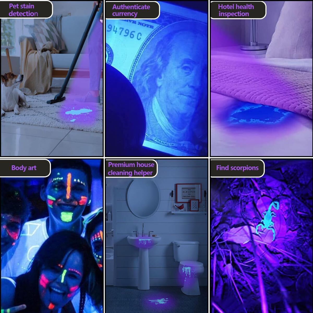 【3イン1機能】黄色、白、黒色のライト機能を1つにまとめた懐中電灯は、ご家庭や屋外での使用にほぼ応えます。 ブラックライト機能を使用する場合は、追加の懐中電灯を購入する必要はもうありません。電源ボタンを押すだけで切り替えることができます。