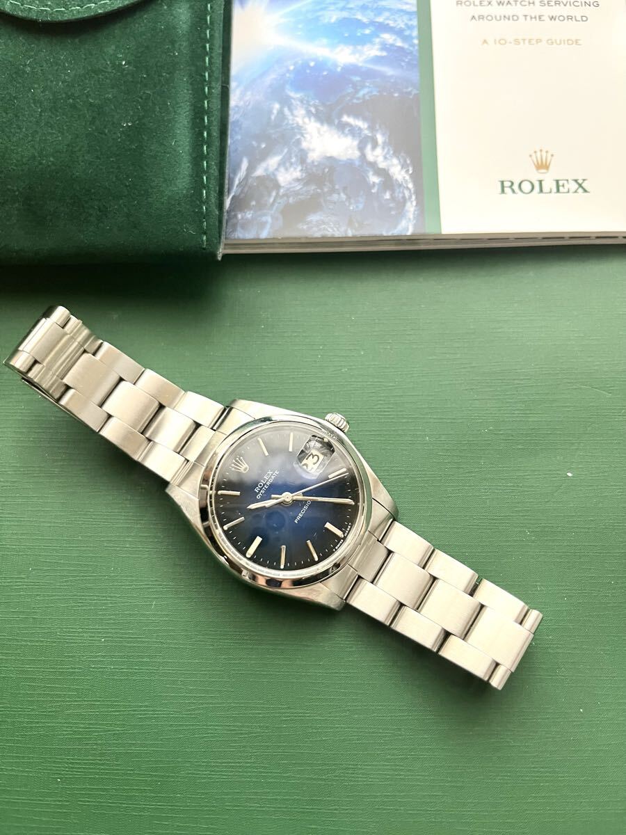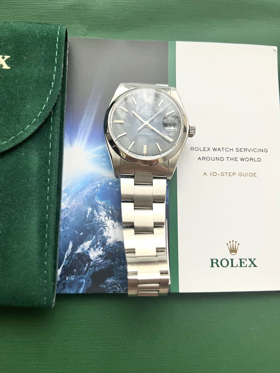 ダークブルーの文字盤とステンレススチールのブレスレットを備えたROLEX Precision腕時計。