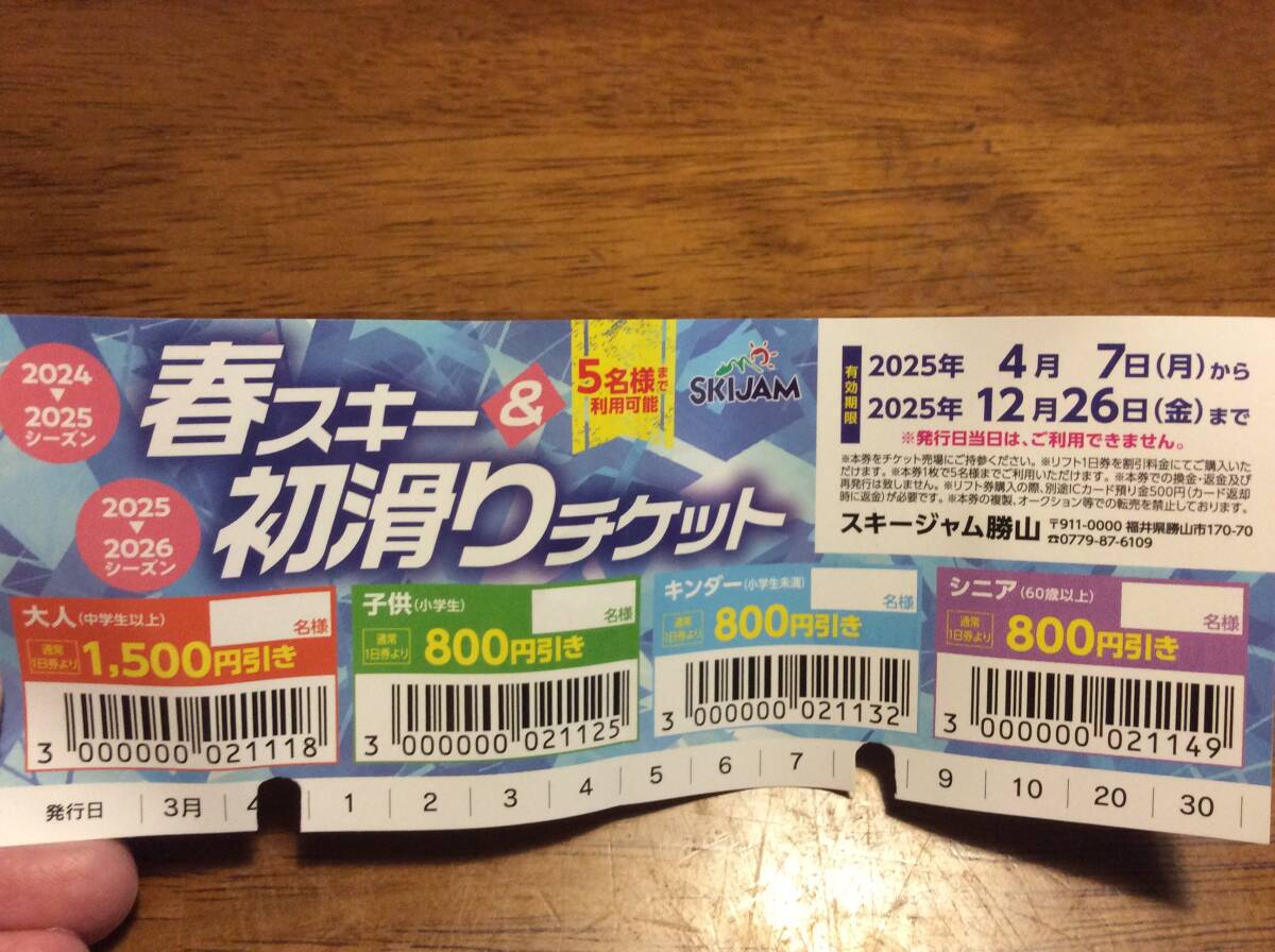 スキージャム勝山 割引券 12月26日まで 5名様まで 初滑り スノーボード 最大7500円割引 クーポン SKIJAM