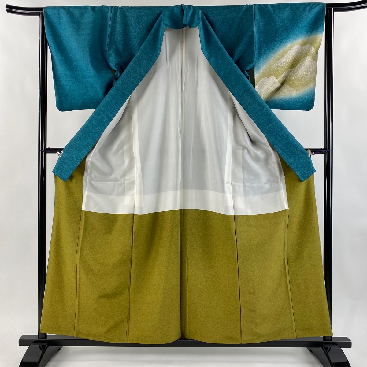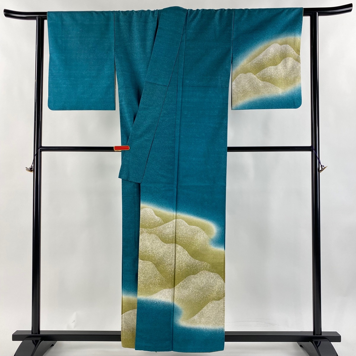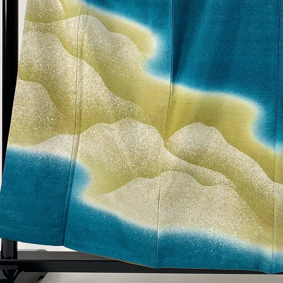 | 付下げ 美品 逸品 落款 証紙 牛首紬地 霞 幾何学模様 染め分け ぼかし 青緑 袷 身丈158.5 裄丈64 M 正絹 【中古】 |