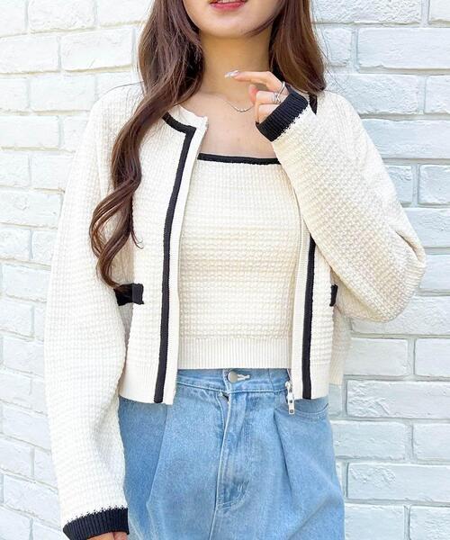 参考商品名:フロントジップ配色ニットカーディガン+キャミアンサンブル