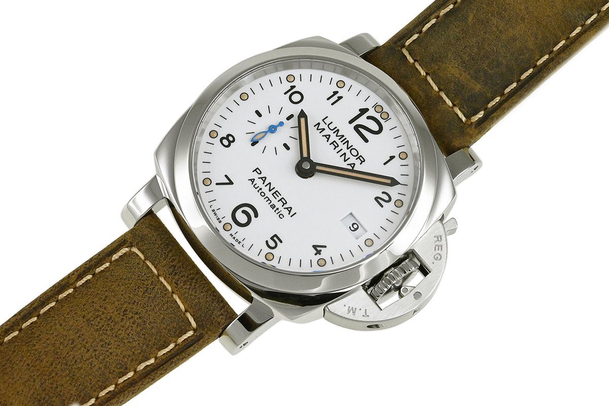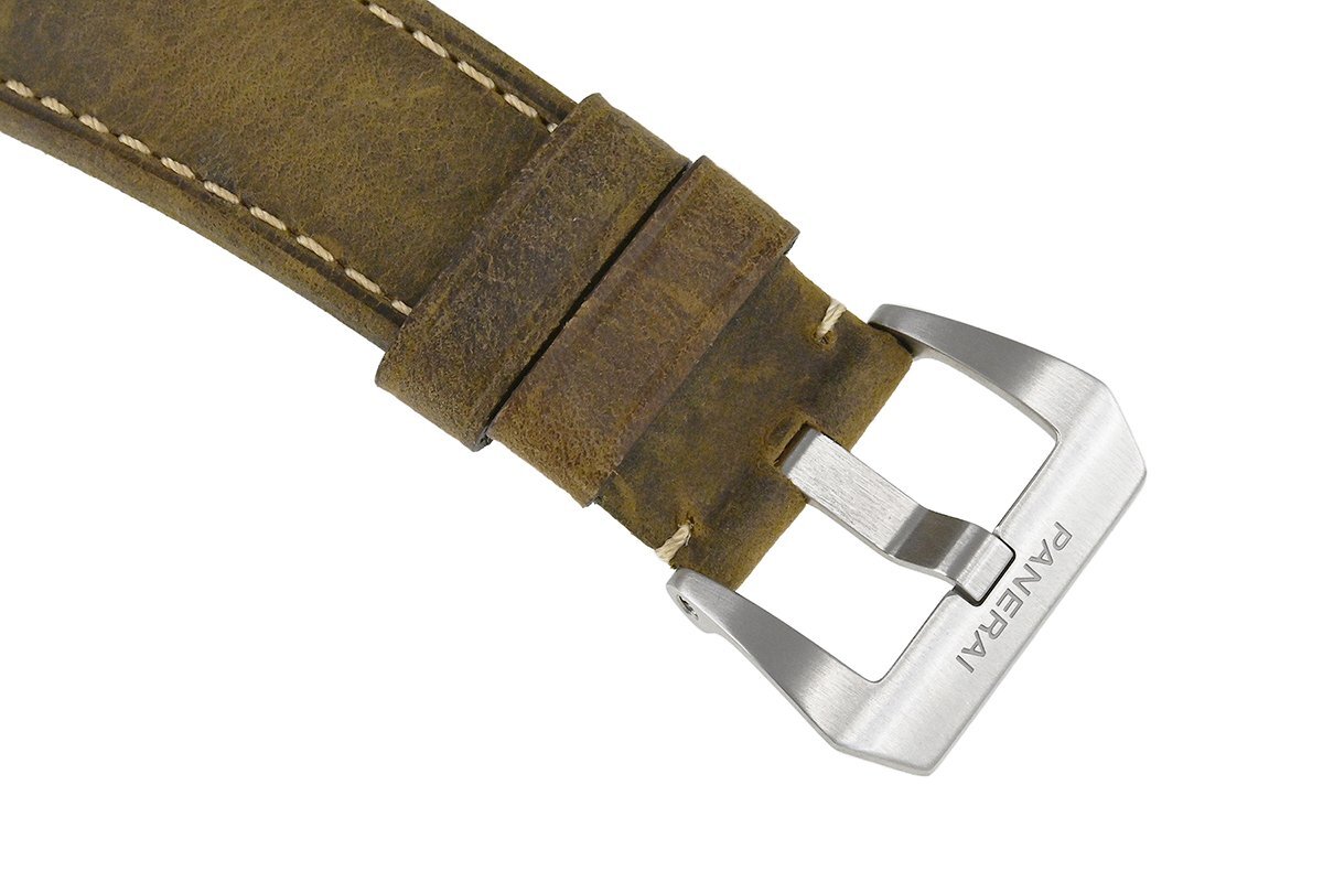 【コメント】 力強いケースデザインで人気の「ルミノール」シリーズ、少しスリム化したケース径42mmサイズの「PAM01523」です。3時位置にデイト表示、9時位置にスモールセコンドを搭載、3日間のパワーリザーブを備える自動巻P.9010キャリバー搭載しています。スモールセコンド秒針のパネライブルーがアクセントとなっています。少々の軽い擦りキズはありますが目立つ様なキズはありません。革ベルトは軽い巻き癖があり、おもて面に少し擦れや追加で穴が内側に1つにあけられておりますが特に傷みはありません。購入時期、オーバーホール歴は分かりませんが、現在精度は平置きで日差+9秒程です。
