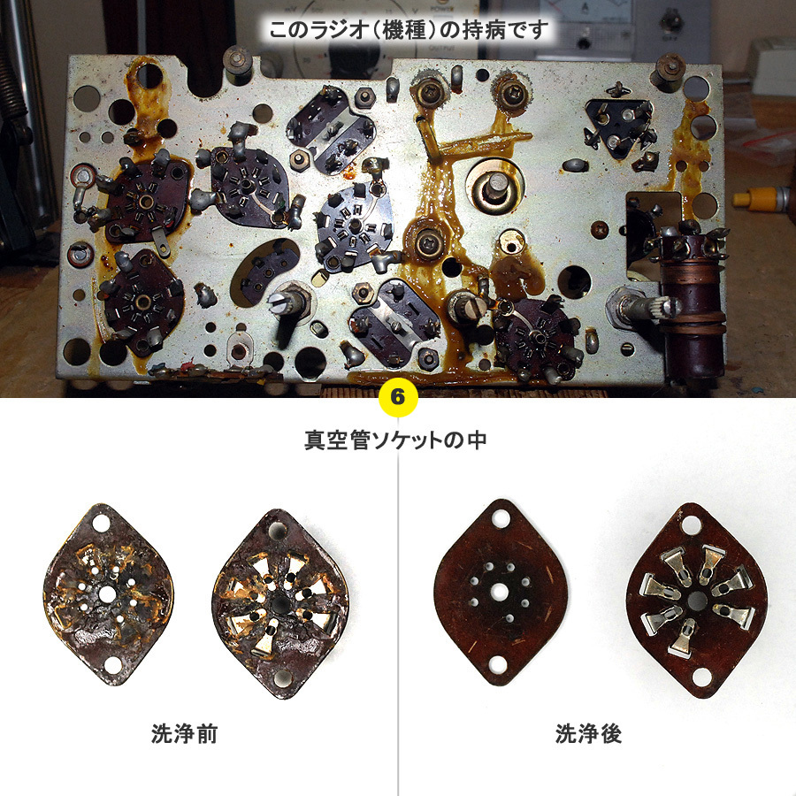 本機のゴムブッシュ(バリコンの固定、シャーシの固定)は、耐熱性が低いようで、ドロドロに溶解していました。(写真⑥)