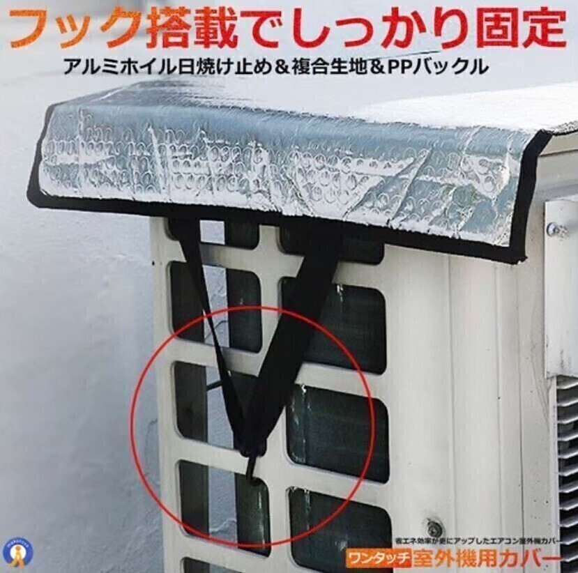 防雨・防雪のアルミホイル生地で、夏でも・冬でも・雨天でも、室外機を保護します。内側は発泡素材を使用しているので、水滴時の騒音を軽減できます。