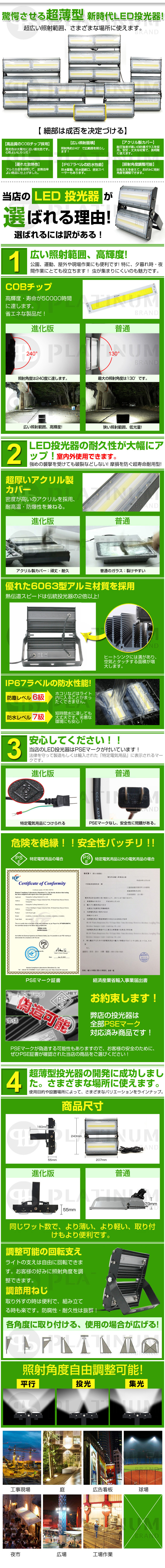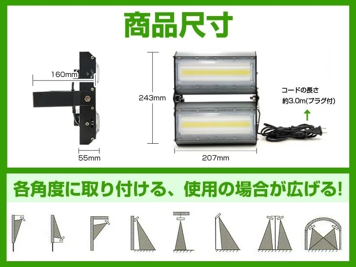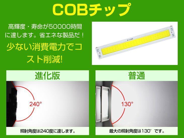 進化版 100W LED投光器 漸く登場! 100Wと省電力で、従来の1400W相当の明るさです! IP67規格の防水仕様!照射角度は240度に達します!公園、運動、屋外や現場作業にも便利です!特に、夕暮れ時夜間作業にとても役立ちます! 虫が集まりにくいの も魅力です。 ◆高品質のCOBチップ採用: 照射角度は240度に達します。高輝度寿命が50000時間に達します。省エネな製品だ! ◆優れた放熱性: 優れた6063型アルミ材質を採用、熱伝道スピードは伝統投光器の2倍以上!ヒートシンクには溝があり、空気とタッチする面積が増大します。 ◆防爆耐震ガラス: 耐圧強度が高いの防爆ガラスを採用。安定丈夫な材質で、長時間に使えます。 ◆IP67ラベルの防水性能: 密封性に優れ、IP67相当の防塵防水性能を実現!場所を選ばず様々な用途の照明に使えます。 ◆照射角度調整可能: 回転支えを使えて、お好みに照射角度を調整できます。 ◆広い使用範囲: トンネル、掲示板、ガソリンスタンド、夜間作業、現場工事、駐車場、公園、運動場にも様々な場所で活躍します!公園、運動、屋外や現場作業にも便利です!特に、夕暮れ時夜間作業にとても役立ちます! 虫が集まりにくいの も魅力です。 【保証】 ◆当商品は12っヶ月保証となります。 ◆お届けから1週間以内にご連絡のあった不良品の保証対応の送料は当方が負担いたします。 ◆保証期間内の不良品ですが、交換のみ対応しております。往復送料はお客様負担となります。在庫がない時だけ返金しますので、ご了承ください。 |