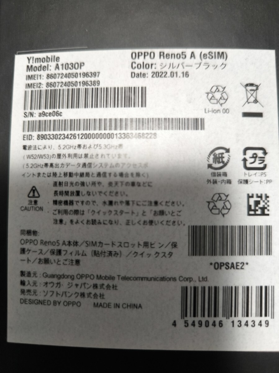 OPPO Reno 5A Yモバイル版 SIMフリー
