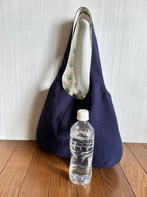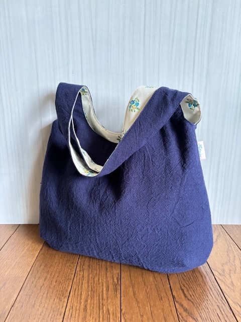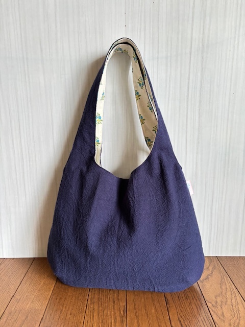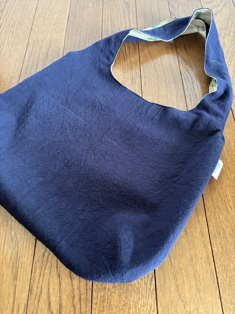 ハンドメイド ワッシャー加工ハーフリネンネイビーまるみのあるトートバック 肩掛けもできます!