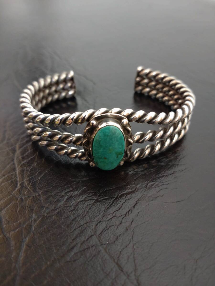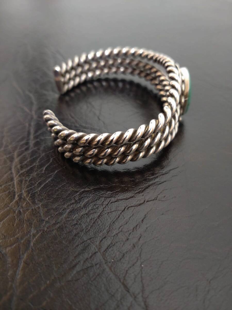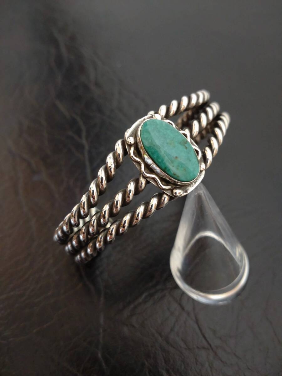 美しいターコイズとツイスト銀細工が特徴的な一点物のシルバー925バングルです。
