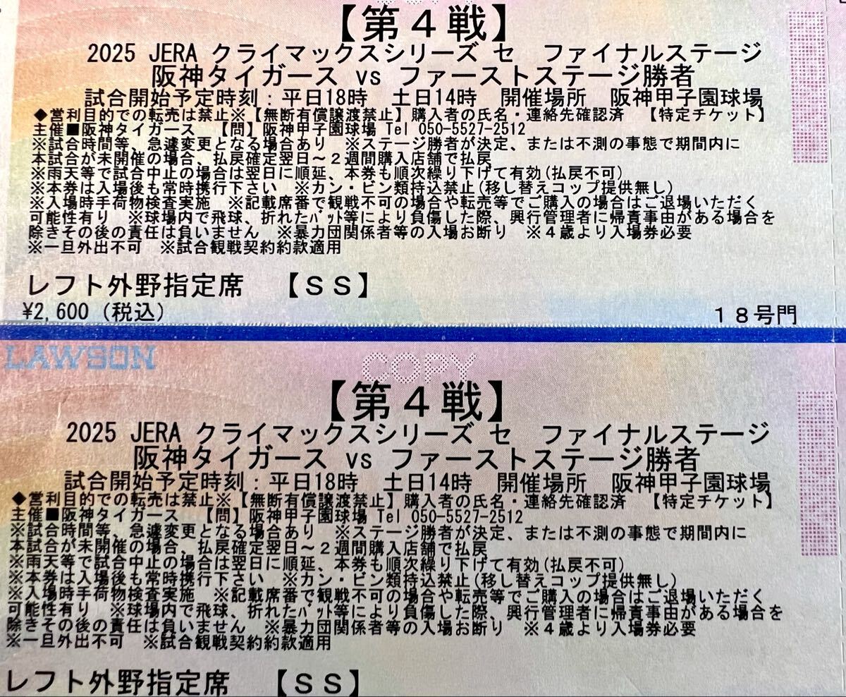☆クライマックスシリーズ第4戦  阪神タイガースvs1st勝者 阪神甲子園球場 レフト外野席 2枚ペアセット☆