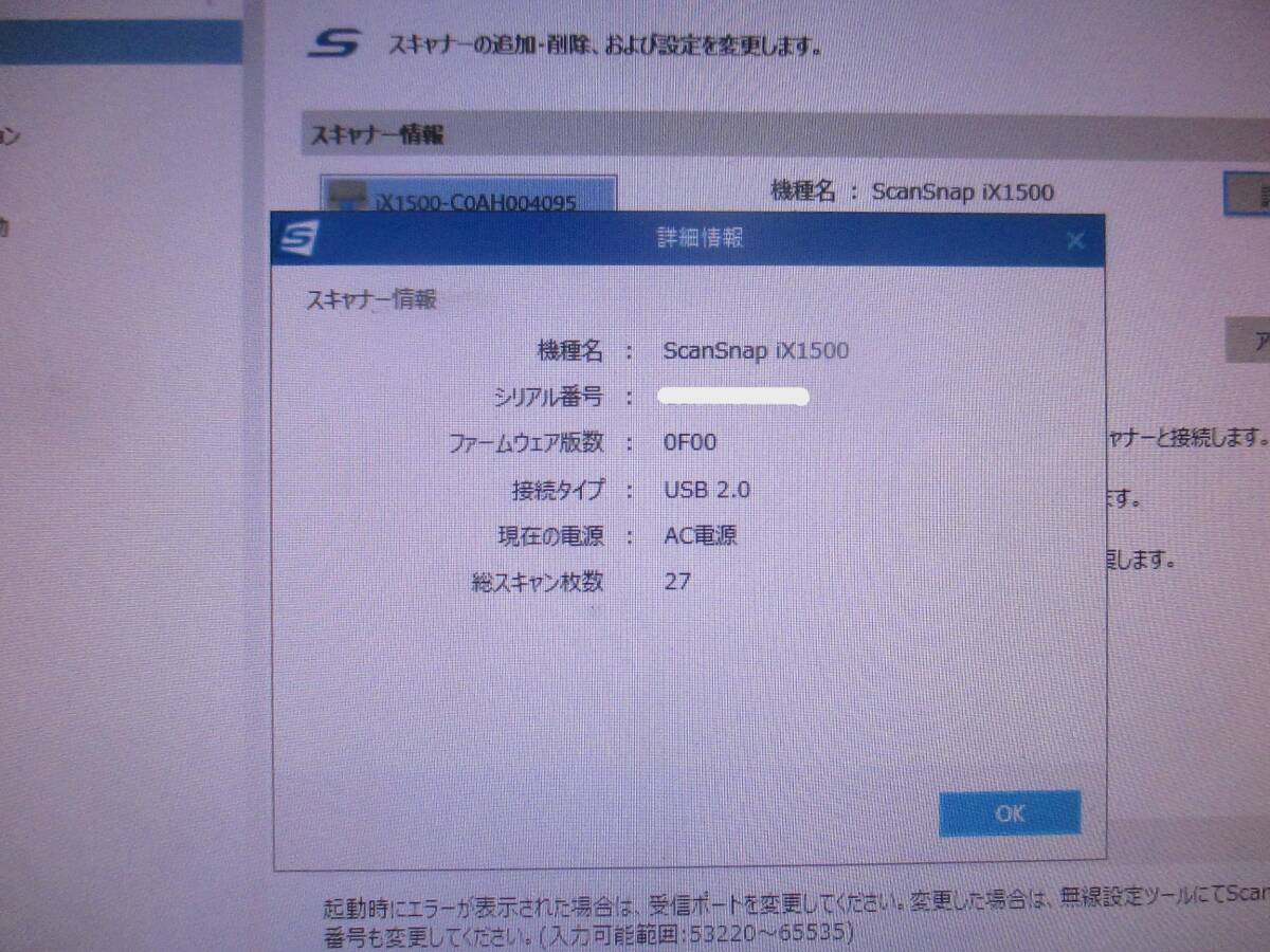 [B4-2/F71004-5]美品★FUJITSU スキャナー ScanSnap iX1500 総スキャン枚数27枚★