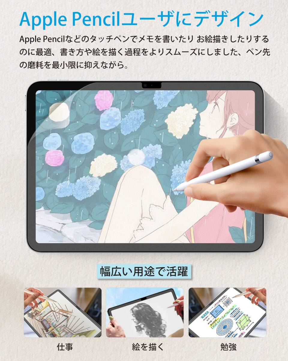 【紙のような描き心地】iPad 10世代 フィルムの正面に日本からの高密度素材を採用しており、紙の摩擦と抵抗があるので、iPadユーザーが紙に描くような感覚を提供して、書く、描画、ノートの書き込みなど書くことに集中できます。なお、ペーパーフィルムはApple pencilと交換性が有ります、大幅にペン先磨耗防止、Apple Pencilでのストロークが滑らかで自然に感じられるような書き心地を実現。