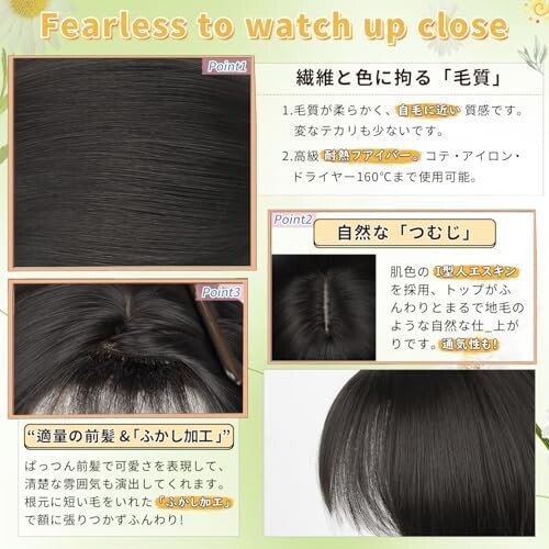 【ご注意】①ご使用のパソコンのモニター設定や部屋の照明により、実際の商品と若干色味が異なる場合があります。 ②それぞれの人に合った長さにデザインされており、好みに合わせてカットすることができます。 ③静電気や絡まる場合は柔軟剤やトリートメントでケアすれば大丈夫です。