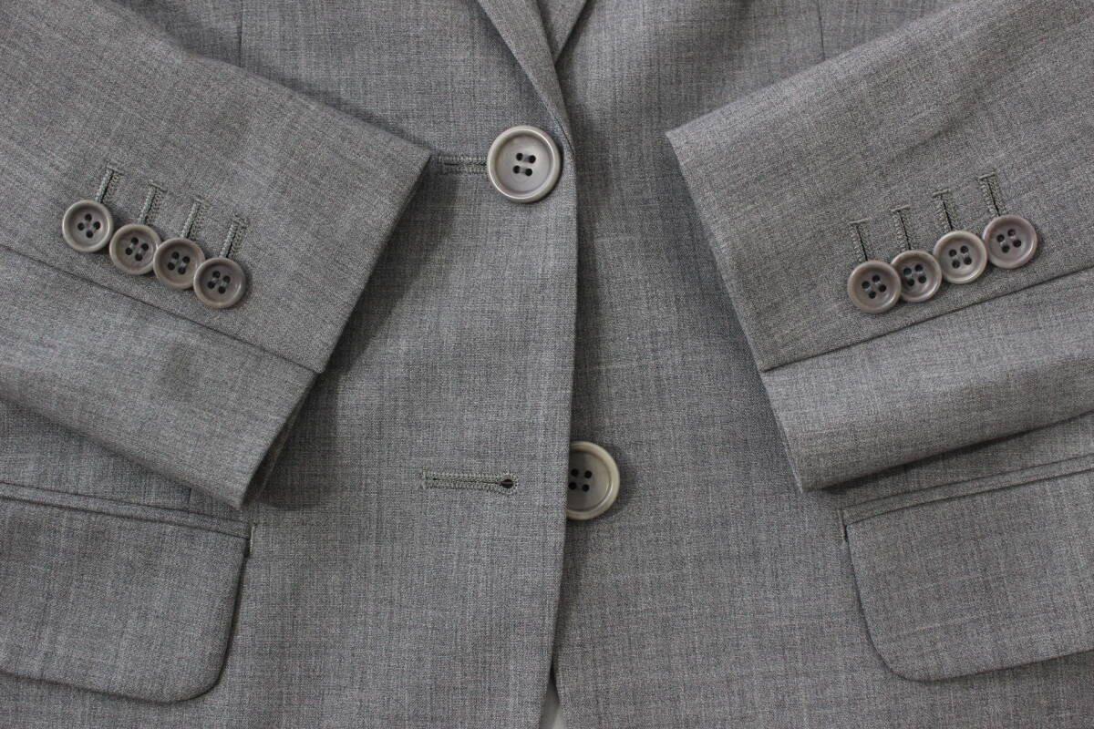 ジャケット:2つボタン・総裏仕立て・サイドベンツ仕様。袖は本開きの本格仕立てで、上質感があります。腰ポケットには仕付け糸がついたままの状態です。