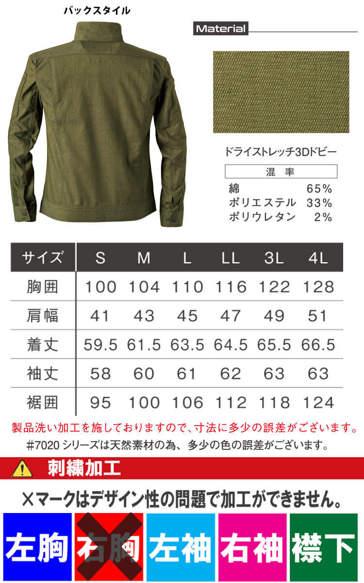 作業服 春夏 アイズフロンティア ドライストレッチ3Dドビーワークジャケット 7020 Sサイズ 10カーキ