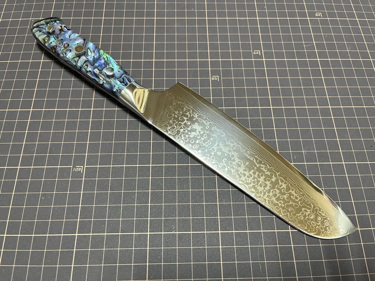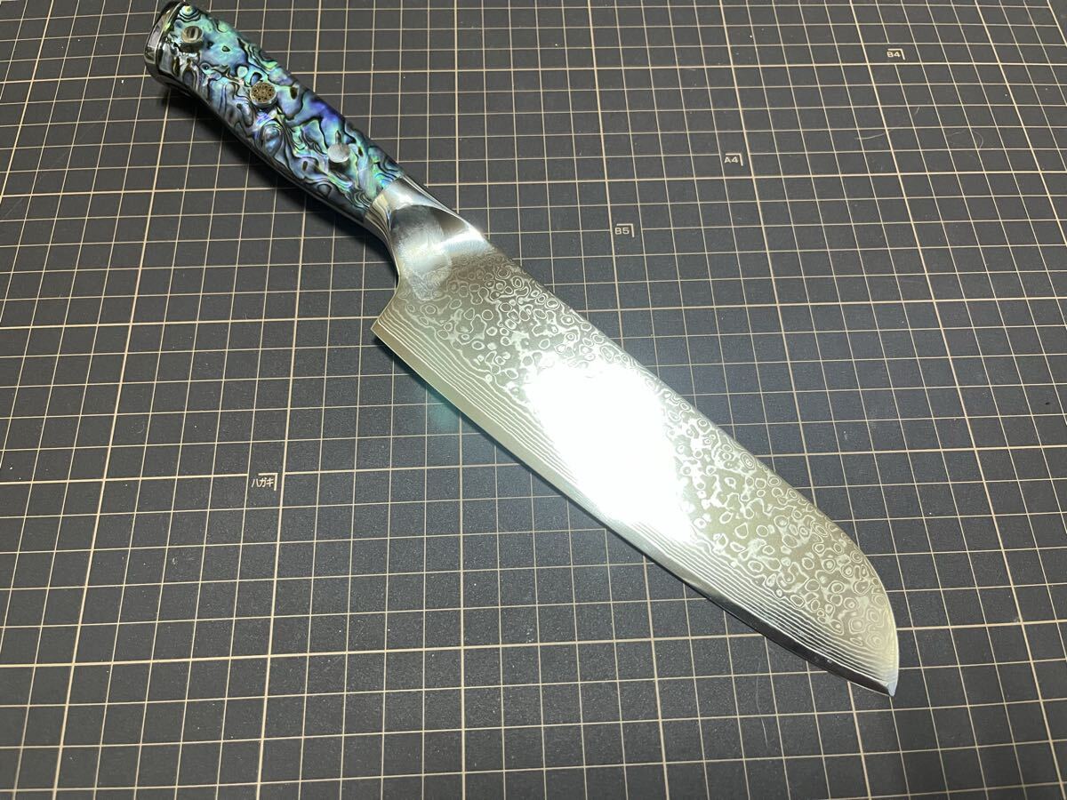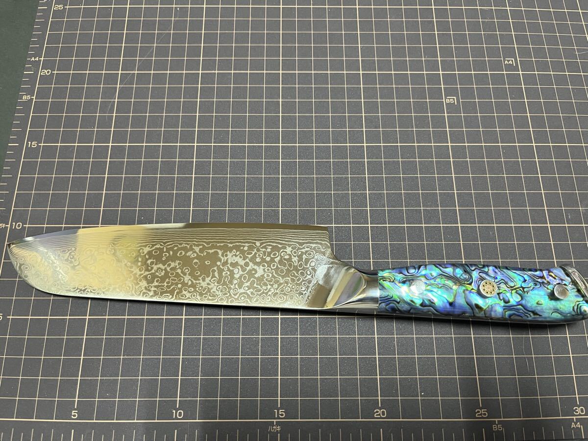 ダマスカス模様の刃と青色装飾のハンドルが特徴的な三徳包丁。