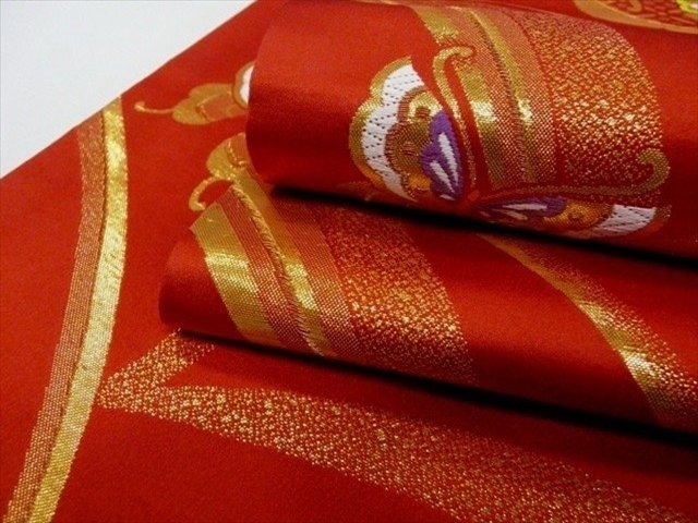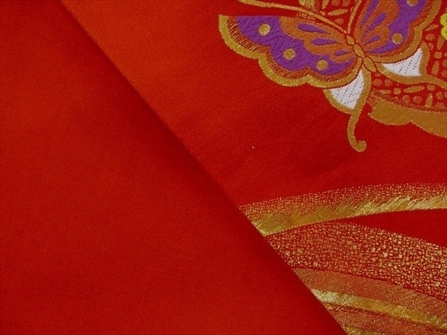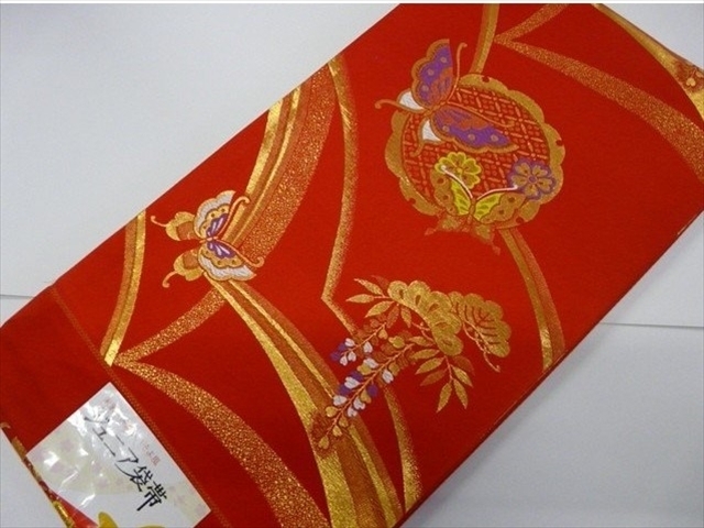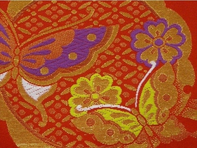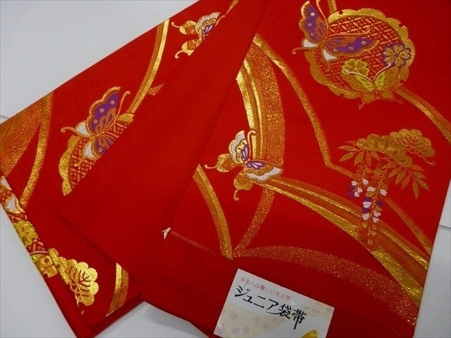 ジュニア袋帯 絹交織 日本製 赤 雪輪 蝶 未仕立て七五三 028