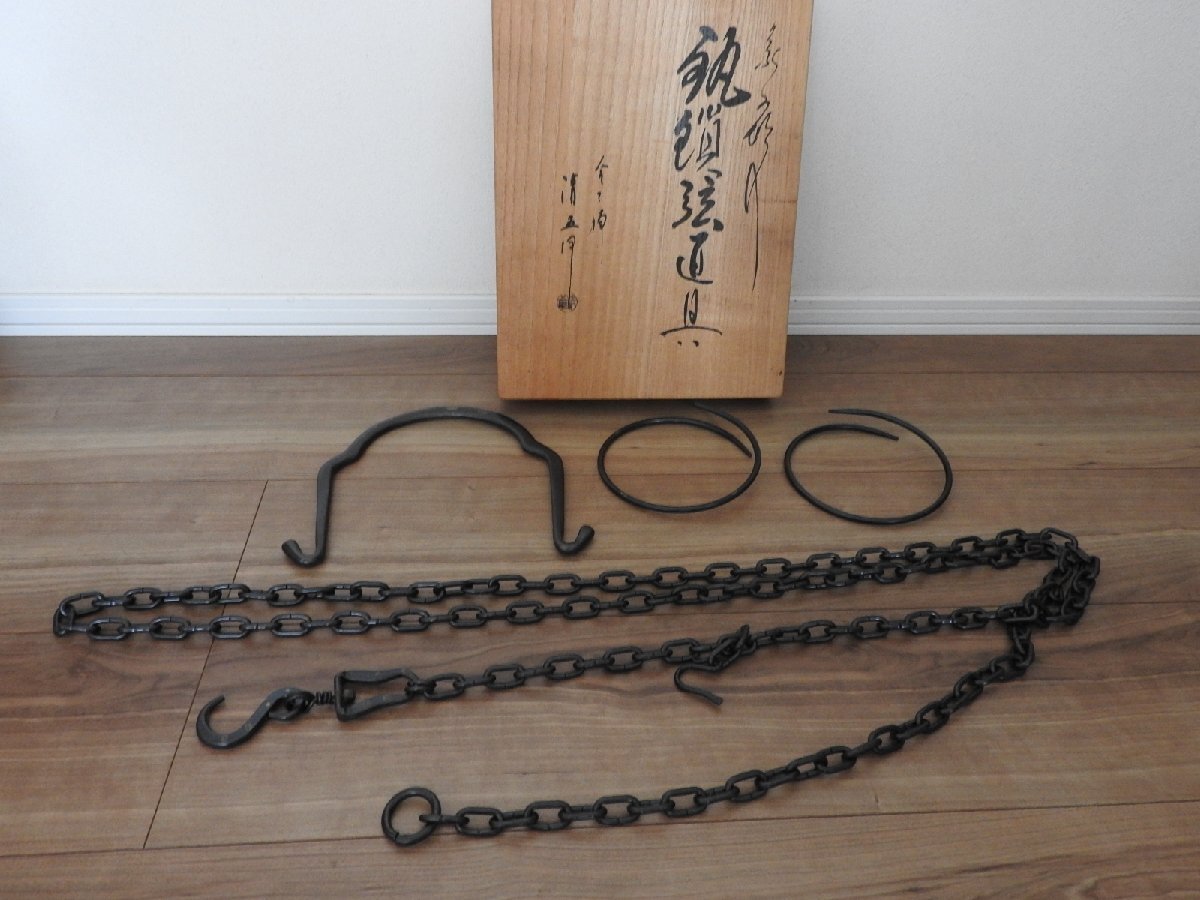 ★★茶道具 金工師 2代目 木村清五郎 象嵌入 鉄製 大鐶・ 釣手鎖・釣手弦 道具 利休鎖セット 共箱