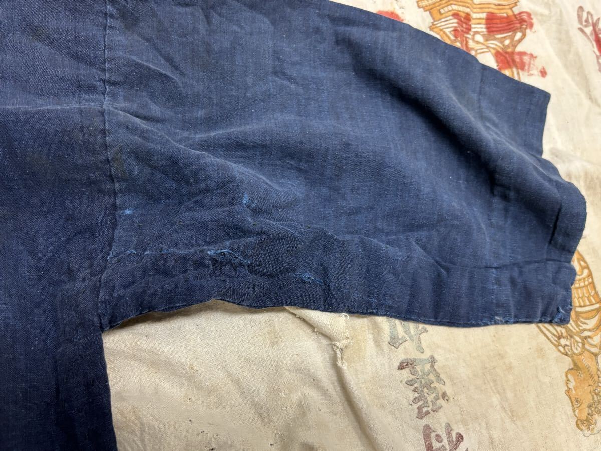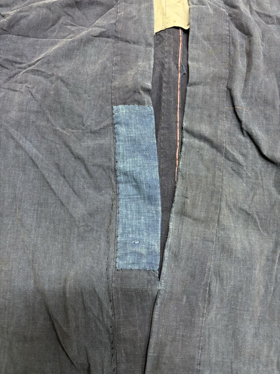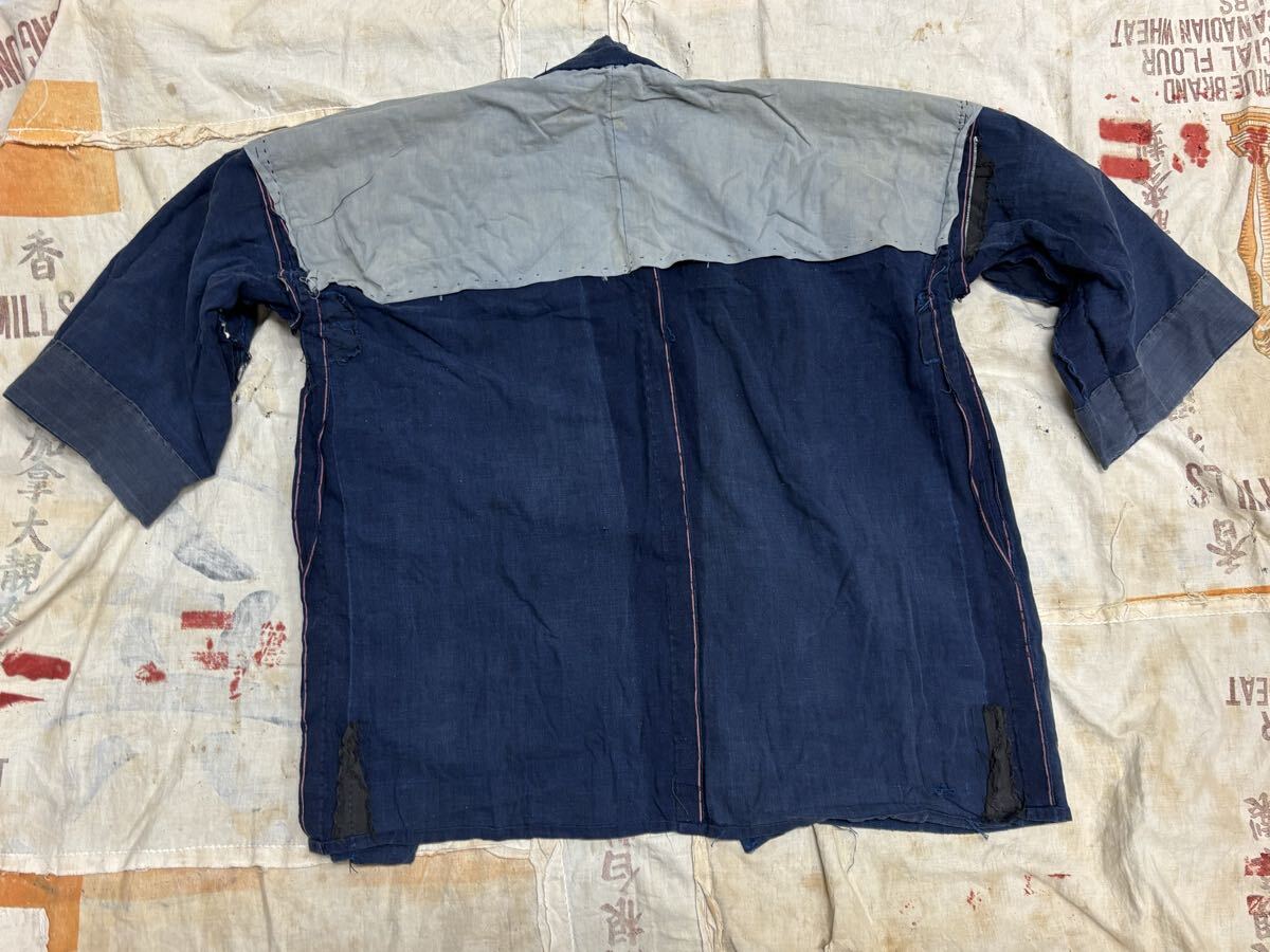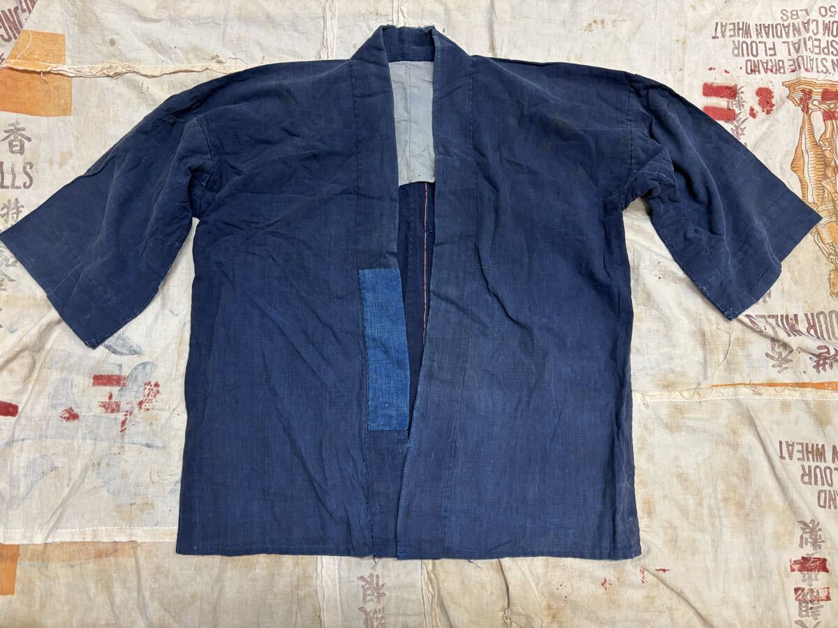 こちらの羽織りも着込まれた藍染めがいい風合いになっており、ヤブレた箇所もパッチワークで補強してあるのも