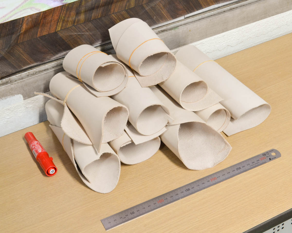 【タンロー】タンニンで鞣してろうけつ染めに都合がいいように脱色・脱脂加工を施した革です。